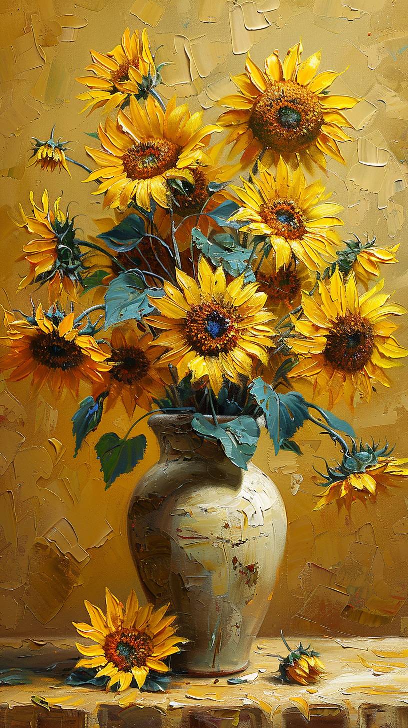 لوحة جميلة لزهور عباد الشمس بأسلوب فنسنت فان جوخ، مع خلفية صفراء، وزهرية مليئة بأزهار عباد الشمس، وتفاصيل معقدة للبتلات والمراكز.
