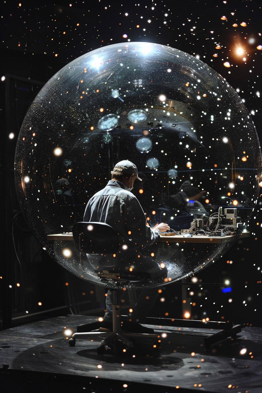the expansive blackness of space dotted with distant stars inside of which floats a single pill-shaped bubble of opaquereality that encapsulates someone sitting at an electronics work bench soldering a component to a board held in a pcb vice, the pill encapsulates the entire reality of the individual for to them they have no clue about the blackness of space just beyond their reach --ar 2:3 --v 6.0