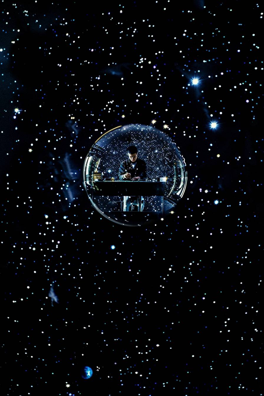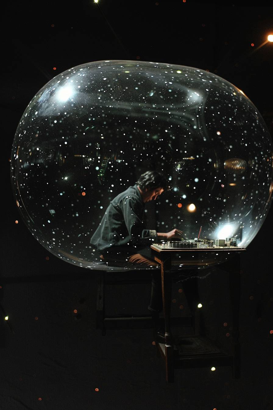 في اتساع سواد الفضاء، فقاعات على شكل حبة تحتوي شخصًا يقوم بلحام مكونات على طاولة إلكترونية، دون معرفة الظلام بالخارج.