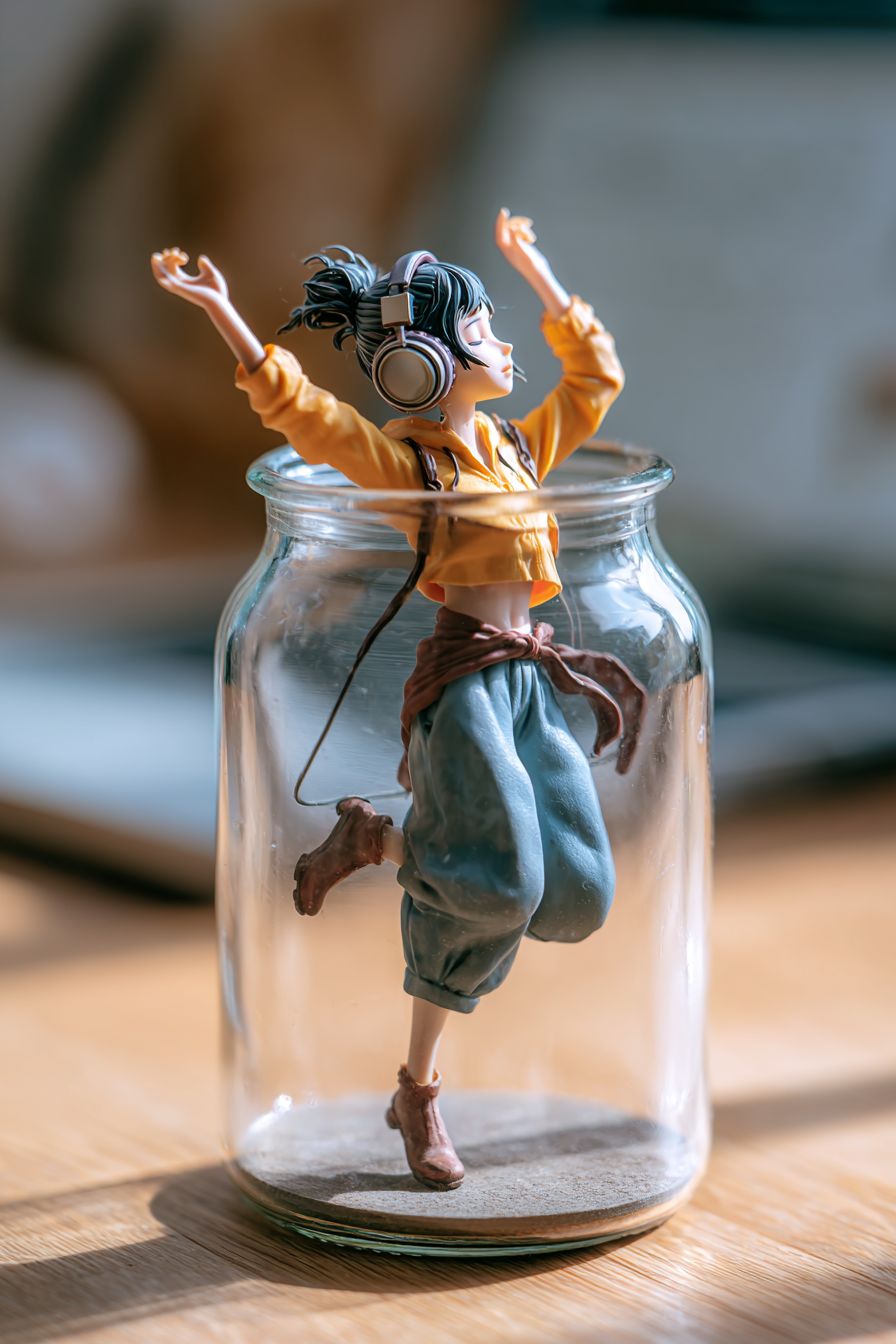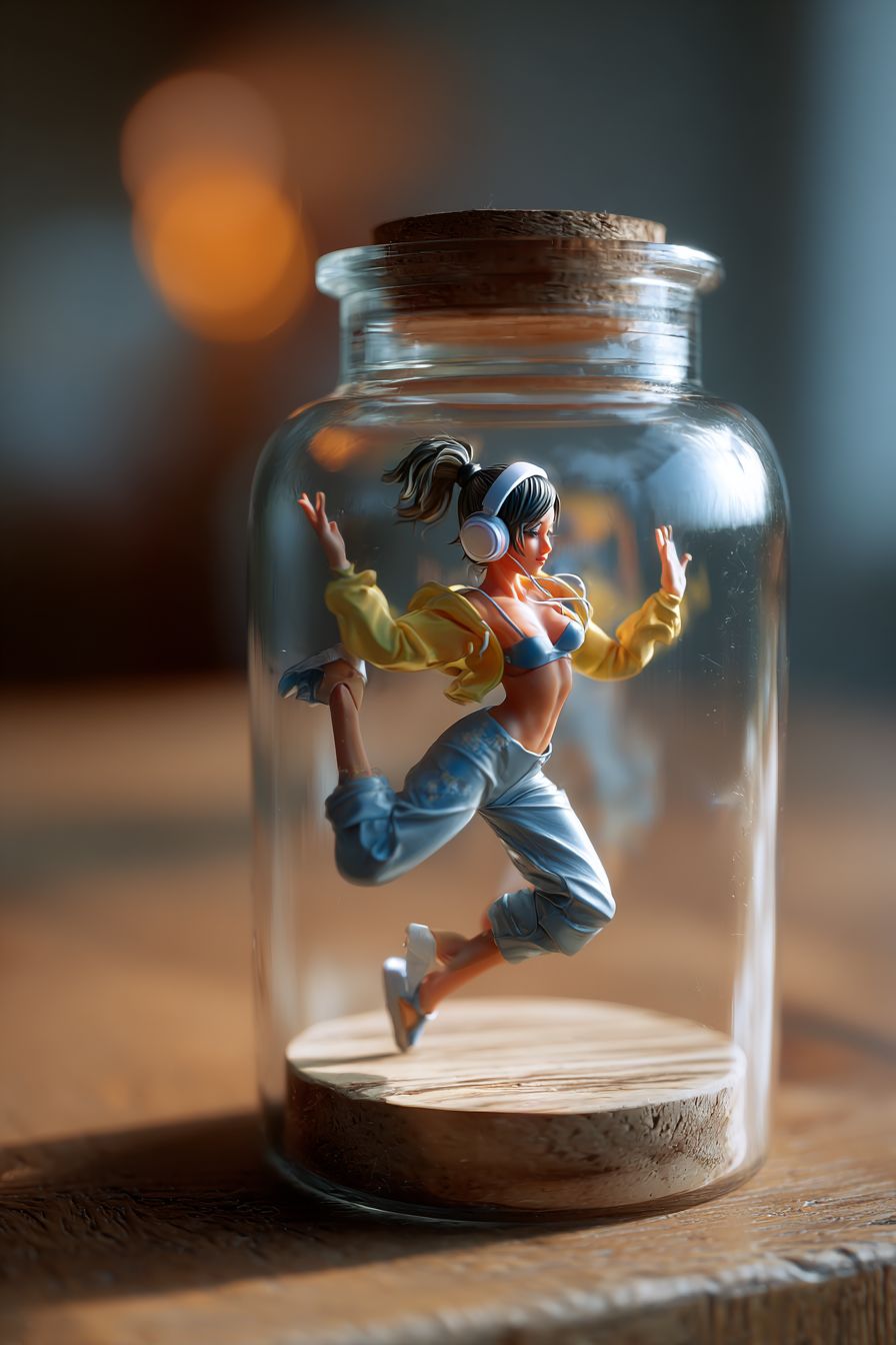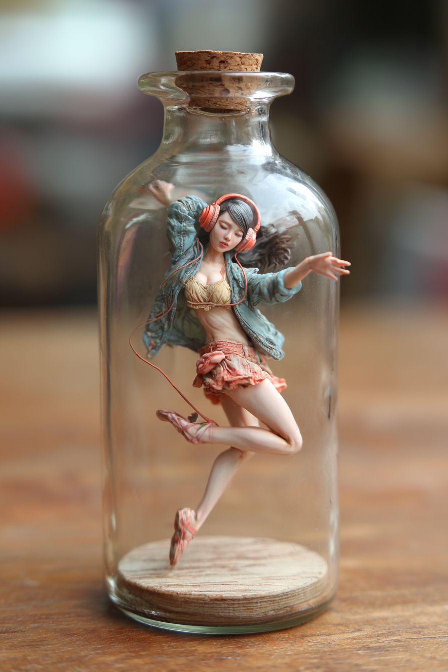 إنشاء ديوراما مصغرة فائق الواقعية داخل زجاجة شفافة تضم امرأة آسيوية جميلة في وضعية رقص ديناميكية مع سماعات أنيقة