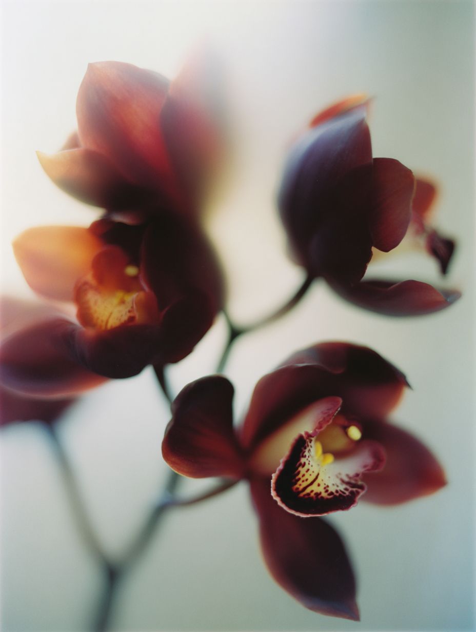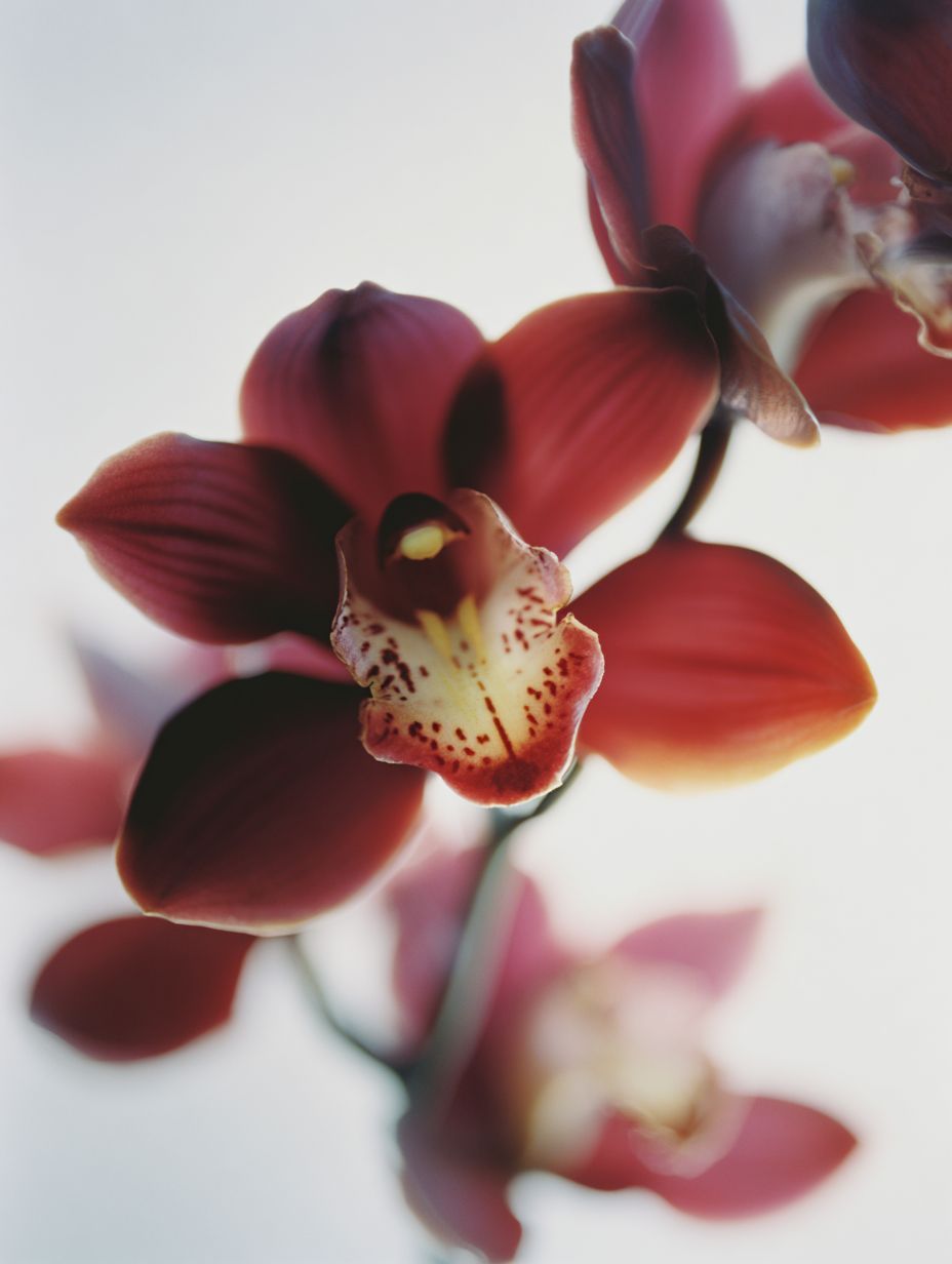 لقطة مقربة لفرع من نبات الأوركيد البورغندي الغني، بتلات مخملية مع انتقالات سلسة من ظلال الأحمر والبني، مركز كريمي بورغندي مع نمط من النقاط، ضوء طبيعي ناعم، خلفية بسيطة، تفصيل عالٍ، جمال نباتي مصقول وفاخر.