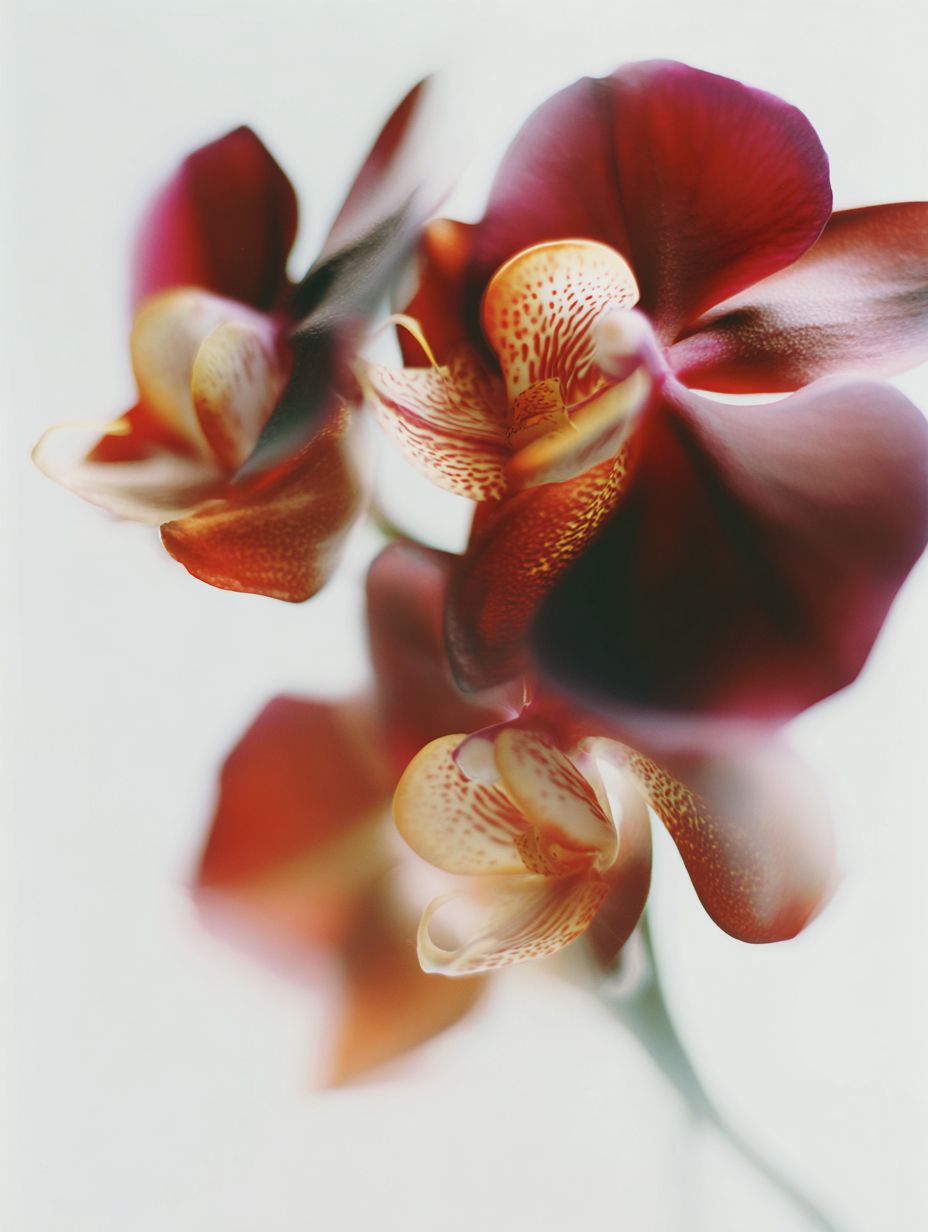 Macro shot of a rich burgundy orchid branch, velvety petals with smooth transitions of red-brown hues, cream-burgundy center with a spotted pattern, soft natural light, minimalist background, high detail, refined and luxurious botanical aesthetics. --chaos 15 --ar 3:4 --raw --sref 4125396339 --profile jkgl7hm --stylize 50 --v 7.0