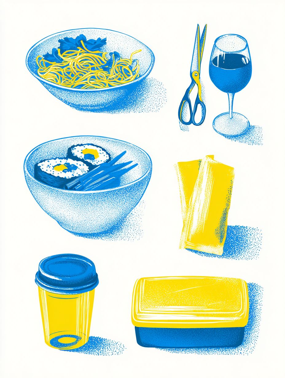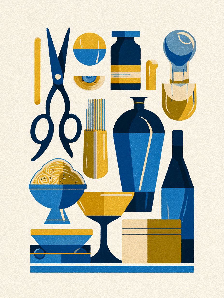 minimal flat illustration of item, vintage modern style, simple geometric shapes,risography, blue and yellow 2 color, hair salon scissors, Tumbler, lunch box, pasta, wine, Katsudon, kimbab, white background, Excluding text --ar 3:4 --v 7.0