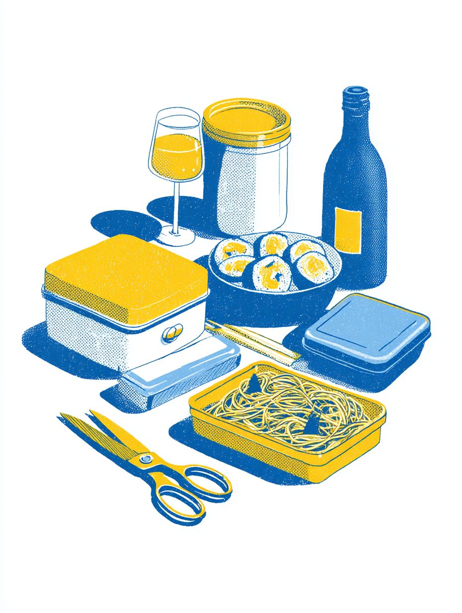 مقص صالون الشعر، كوب، صندوق الغداء، مكرونة، نبيذ، كاتسودون، كيمباب، خلفية بيضاء. توضيح مسطح بالحد الأدنى بأسلوب حديث عتيق، أشكال هندسية بسيطة، لونين أزرق وأصفر، رسومات بأنماط الطباعة.
