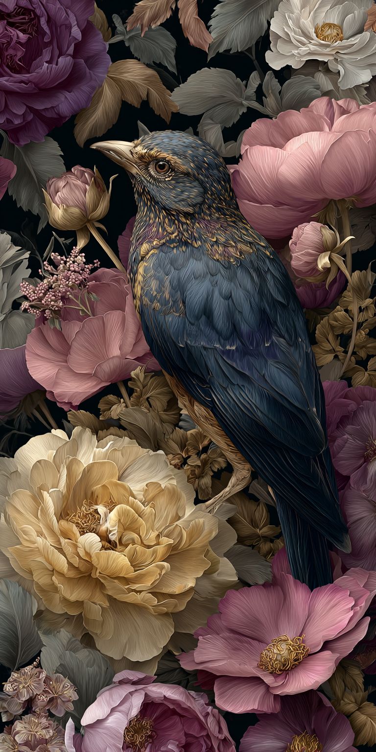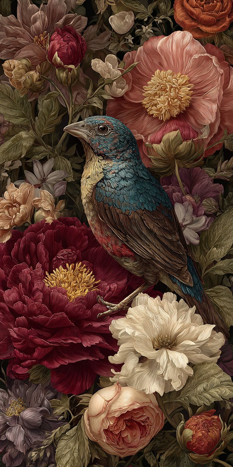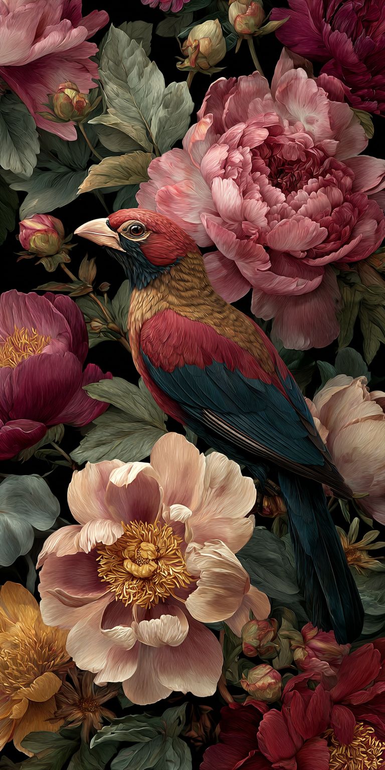 a beautiful bird surrounded by flowers, rich colors, gorgeous feathers, peonies, and other large flowers. this high-definition wallpaper features exquisite details and an ultra-high resolution, showcasing the intricate details of the scene. --ar 1:2 --v 7.0