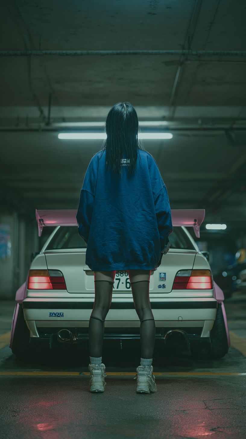 a Japanese woman with long black hair wearing black fishnet stockings standing with back to camera confidently in an underground parking garage, wearing an oversized royal blue crew neck sweatshirt and modern streetwear, a white BMW E36 M3 with pink TE37 wheels behind her, heroic and cinematic atmosphere, strong confident pose, moody lighting, gritty textures, realistic reflections, dramatic composition, fashion editorial style, powerful urban energy --chaos 12 --ar 9:16 --exp 10 --profile rkuh9js --v 7.0