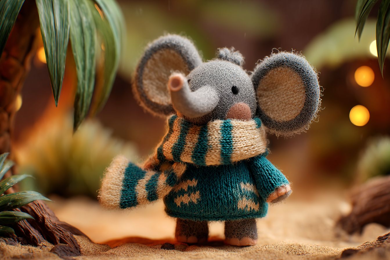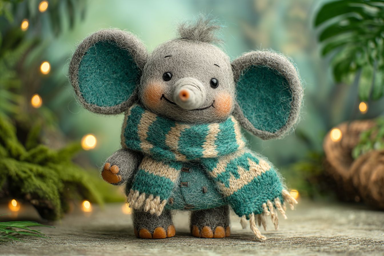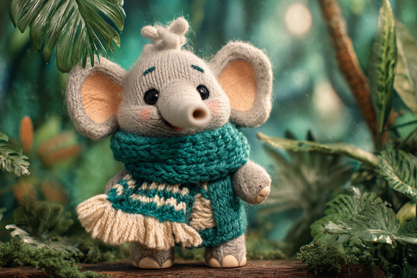 Playful baby elephant in claymation style, wearing handmade teal and cream scarf. Chubby features, fingerprint textures, joyful expression. Set against a jungle background, radiating warmth and handcrafted charm. --ar 3:2 --v 7.0