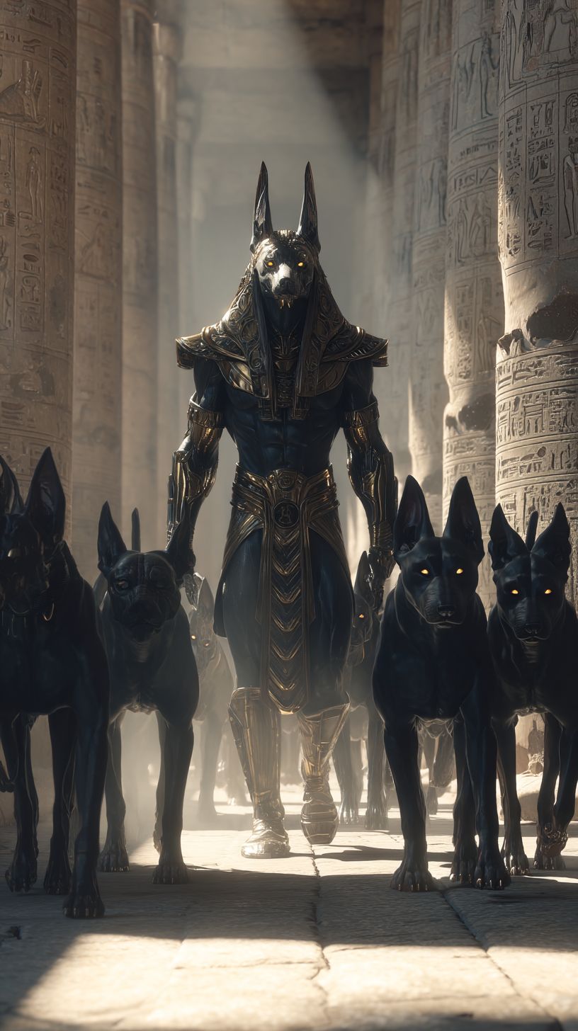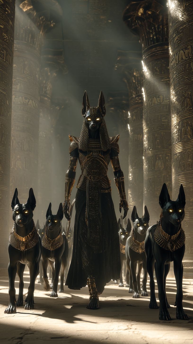 لقطة سينمائية فائقة الواقعية لإله أنوبيس، إله ذو رأس ابن آوى وهو يرتدي درعا من العقيق والذهب المنصهر، يسير مباشرة نحو الكاميرا على ممر حجري أسود، محاطًا بمجموعة من كلاب الصيد المصرية السوداء اللامعة ذات العيون الذهبية، ومعبد ضخم يضم أعمدة مزينة بالهيروغليفية خلفه، وأشعة الشمس المستقيمة تشق الغبار ودخان البخور، وجزيئات دوارة، وانكسارات صريحة في الهواء، واقعية أسطورية، 8k،Textures مفصلة بشكل جنوني على الفرو، المعدن، والحجر، وإضاءة حجمية، وعمق ضحل للمجال، وتركيز حاد على الوجه والعيون، وكاميرا درامية بزاوية منخفضة.