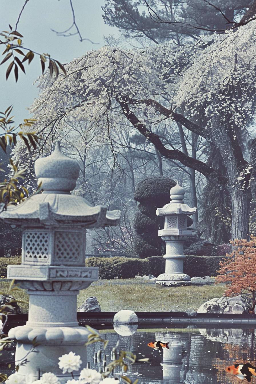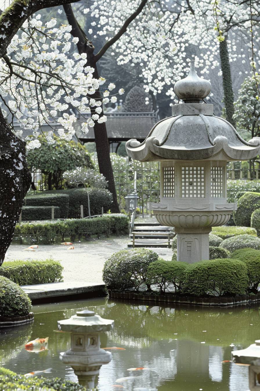 A serene Japanese garden with cherry blossoms in full bloom, stone lanterns, and a small pond with koi fish, soft sunlight filtering through the trees --ar 2:3 --sref 3533047308 --v 6.0