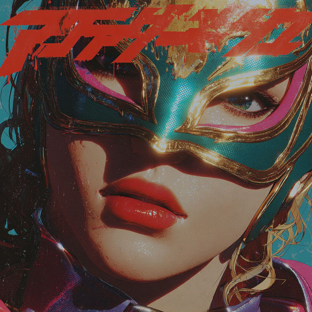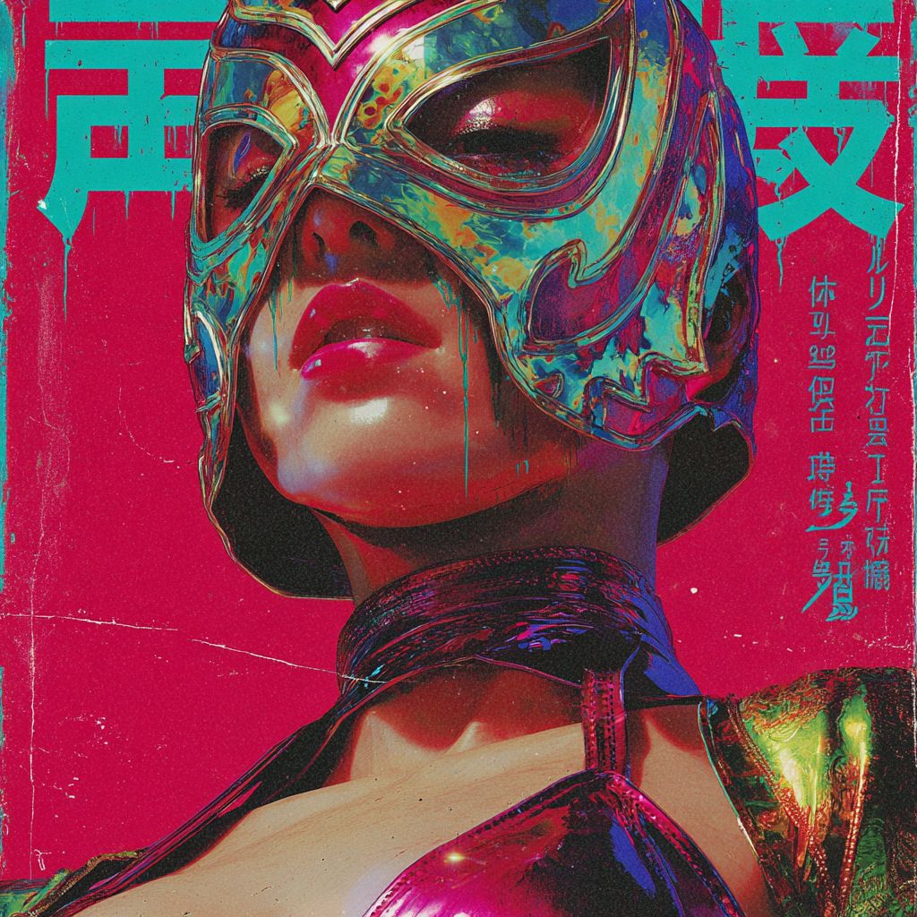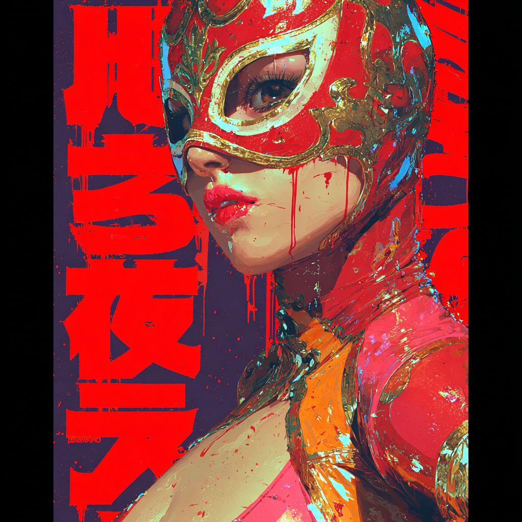 امرأة جميلة ذات شفاه حمراء كبيرة وبشرة مدبوغة، ترتدي زي مصارعة لامع ومشرق ملون وقناع مصارع لامع، أسلوب فن الأنيمي المفصل من قبل يوجي شينكاوا وماساموني شيرو، إضاءة سينمائية، ألوان نابضة بالحياة، ظلال جريئة، فن البوب، طلاء أحمر يتقطر على القماش، نص العنوان في الخلفية، لوحة زيتية فائقة الواقعية، تظليل ثلاثي الأبعاد، خلط رطب على رطب، تباين عالٍ، تركيز حاد، تكوين مثالي.