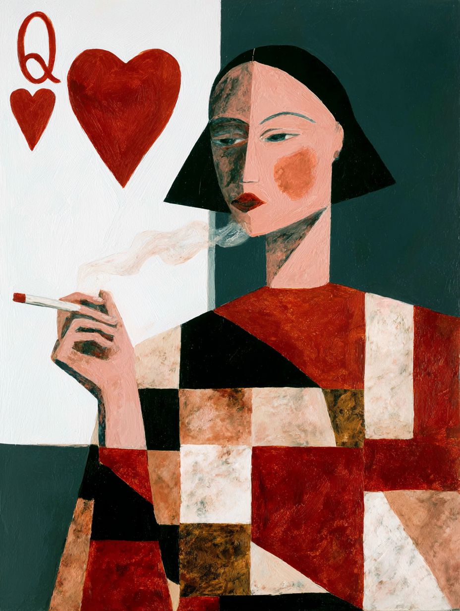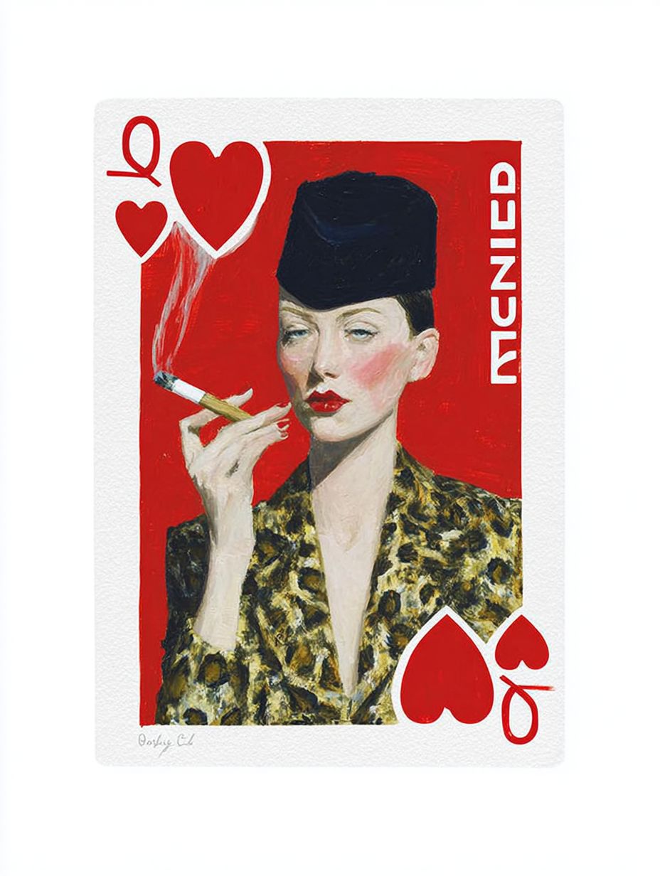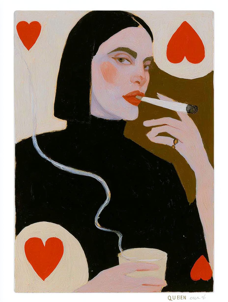 تم إعادة تصور بطاقة ملكة القلوب بأسلوب رسومي معاصر رائع. الملكة أنيقة ومتزنة ومواكبة للموضة، تدخن سيجارة ملفوفة بشكل غير رسمي، حيث يرتفع خيط رقيق من الدخان في منحنى أنيق. أشكال جرافيكية جريئة، خطوط حديثة نظيفة، ولوحة ألوان مصقولة من الأحمر الداكن وألوان الخدود والأسود الفحمي والحيادي الدافئ. تصميم متماثل ومرآتي للبطاقة بدقة مشابهة للمتجهات وزخارف زخرفية متناهية الصغر. أجواء تحريرية معاصرة، وميول أنيقة، وجمالية متقدمة في التصميم، وتأثير بصري عالٍ على خلفية نظيفة.