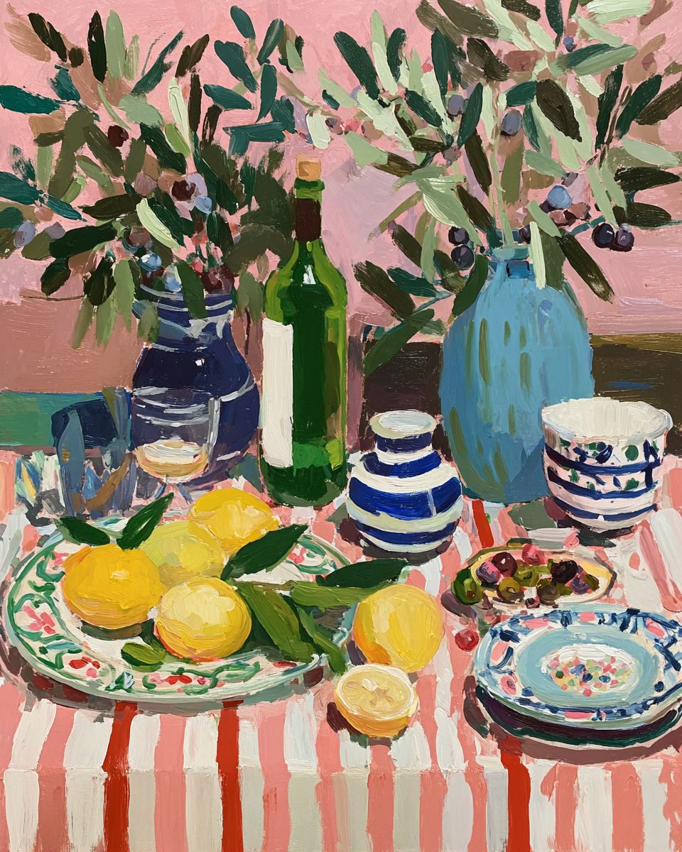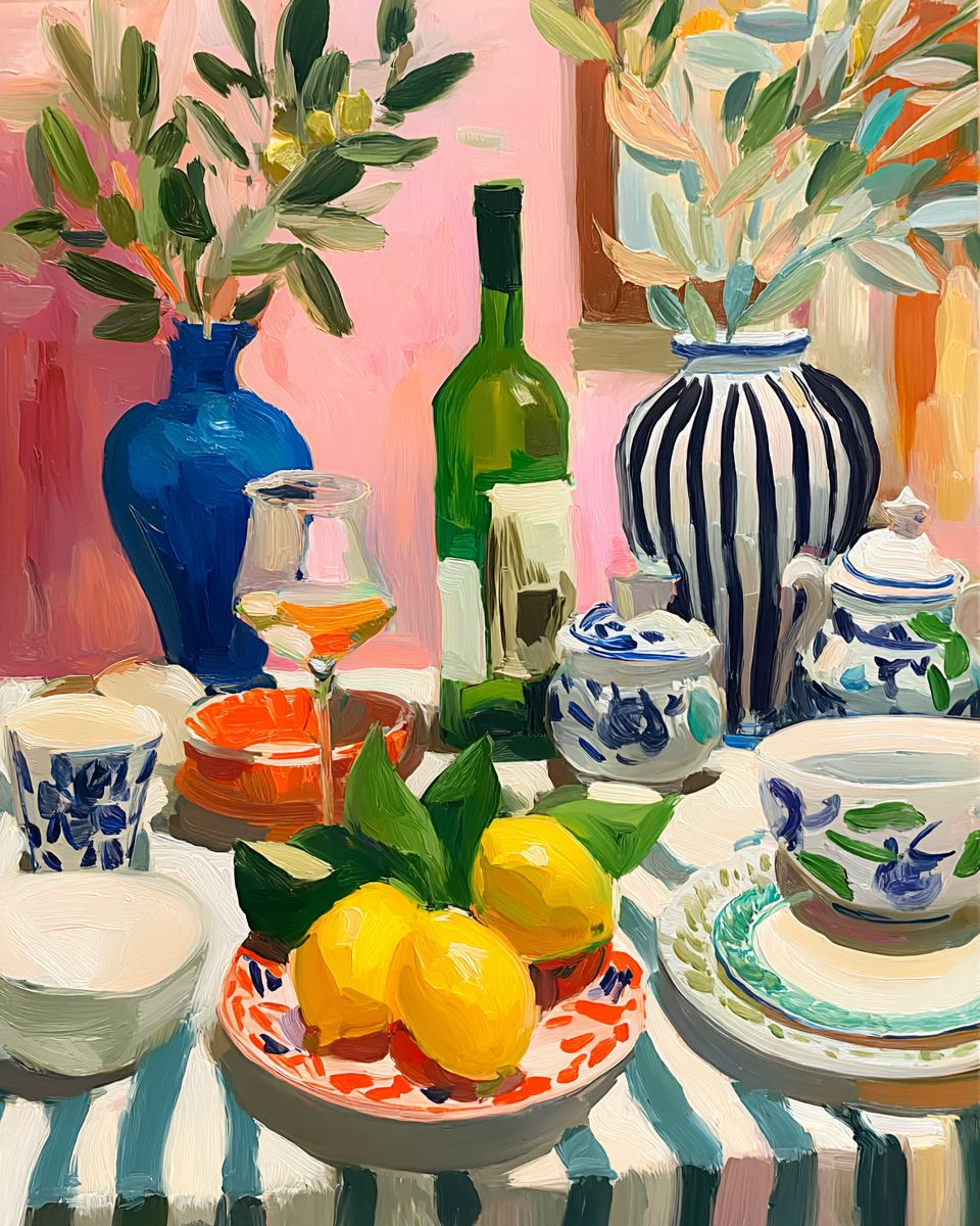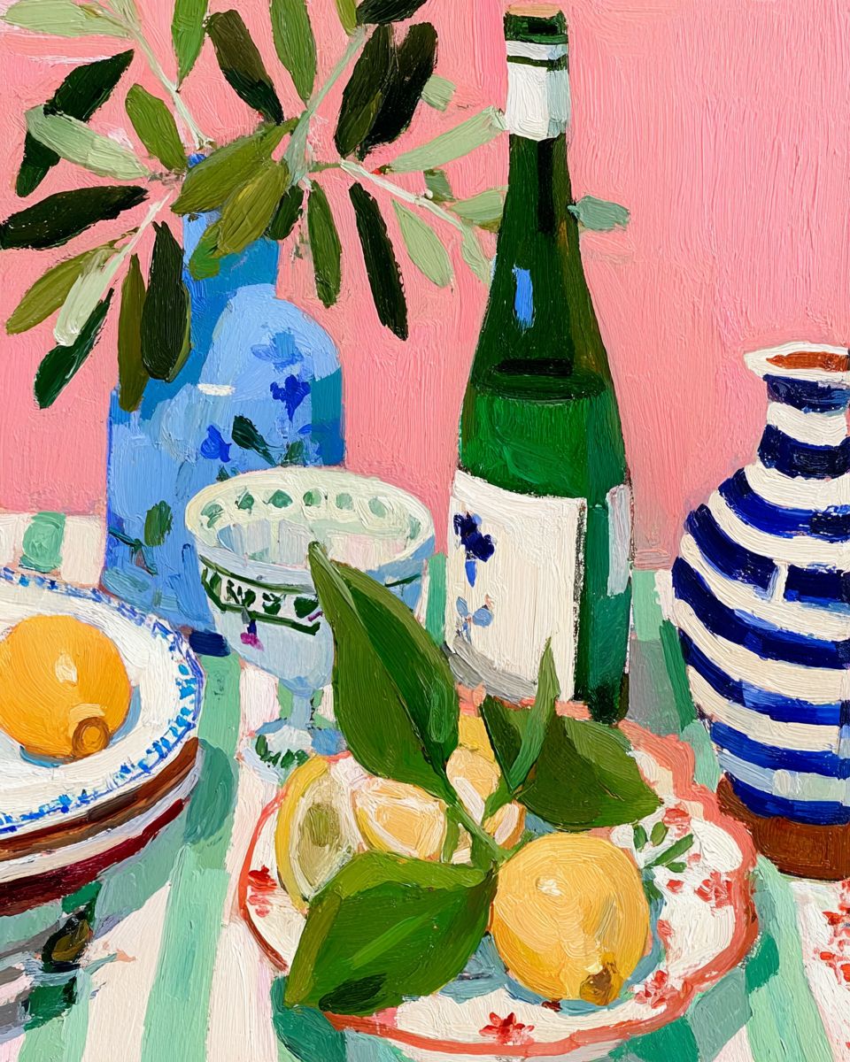 Still life with lemons and olive leaves on a striped tablecloth, in the style of Henri Matisse. The background is pink, with blue vases, a green bottle of wine, plates with navy stripes, and white dishes. There are also blue and white striped vessels, and olive tree branches. --ar 4:5 --profile uunv86y --v 7.0