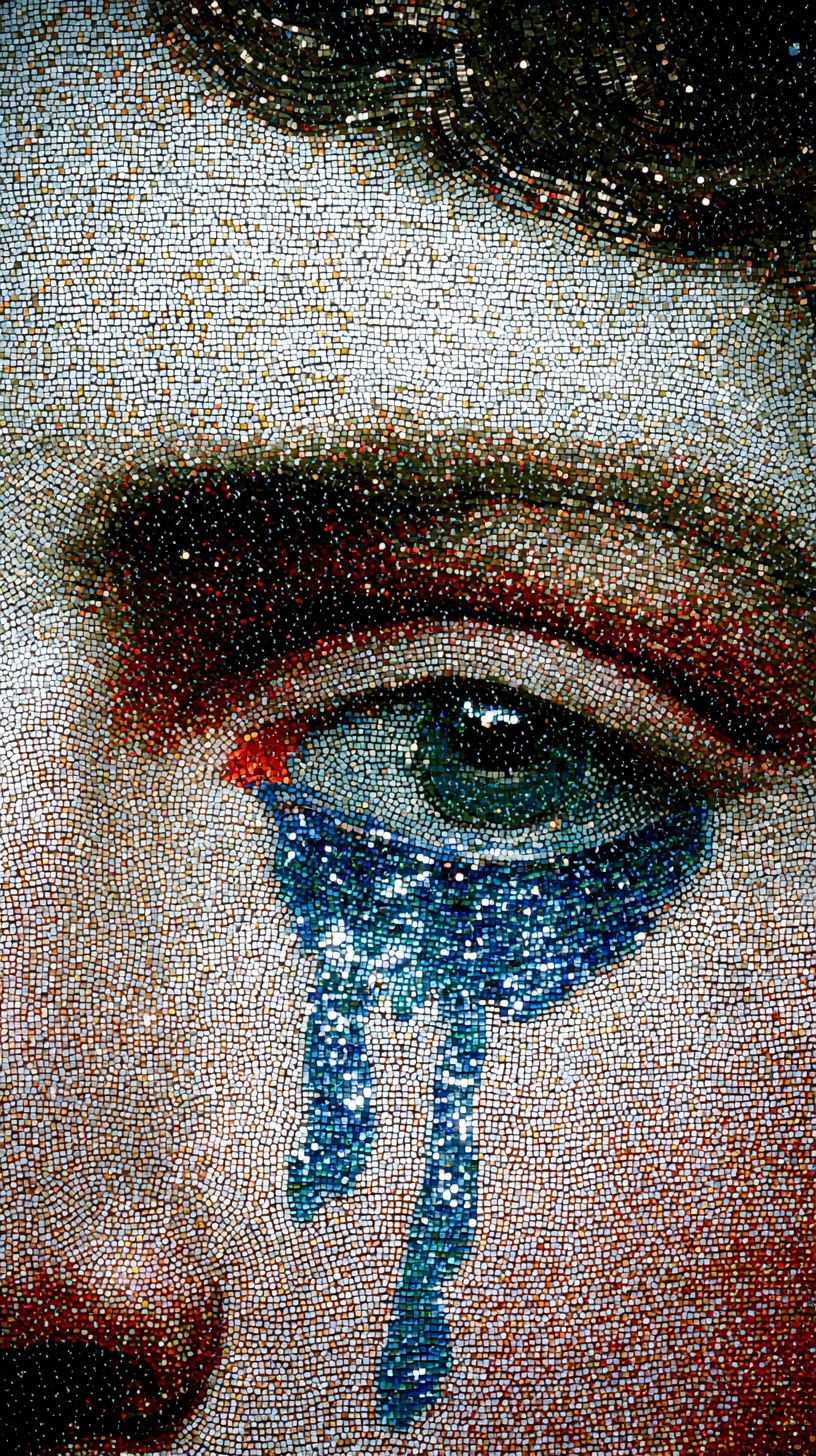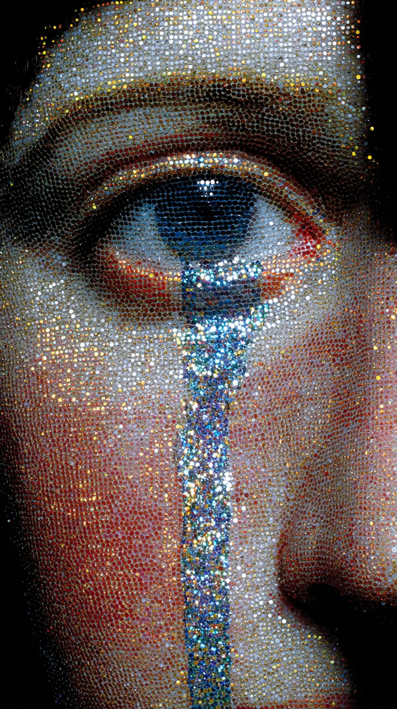a close-up of an eye with iridescent glitter tears you can see flowing from the eye, a man's face is in the background, in the style of christopher bucklow, detailed texture, in the style of peter driben, in the style of craig mullins, in the style of john trumbull and zdzisław beksiński, close-up of male eyes, in the style of kandinsky. --ar 9:16 --raw --sref 2950286783 --profile 8anvgfo