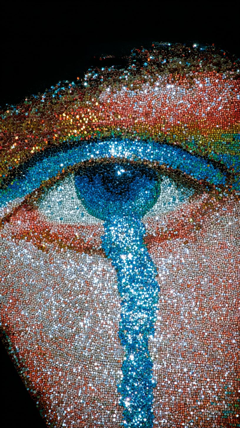 لقطة مقربة لعَيْن يخرج منها دموع لامعة ملونة، وهناك وجه رجل في الخلفية
