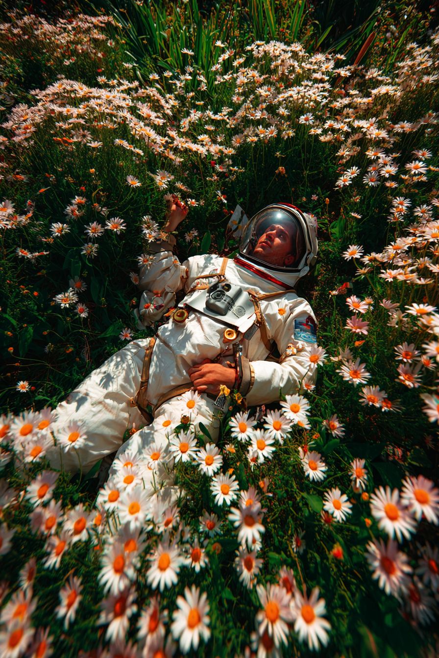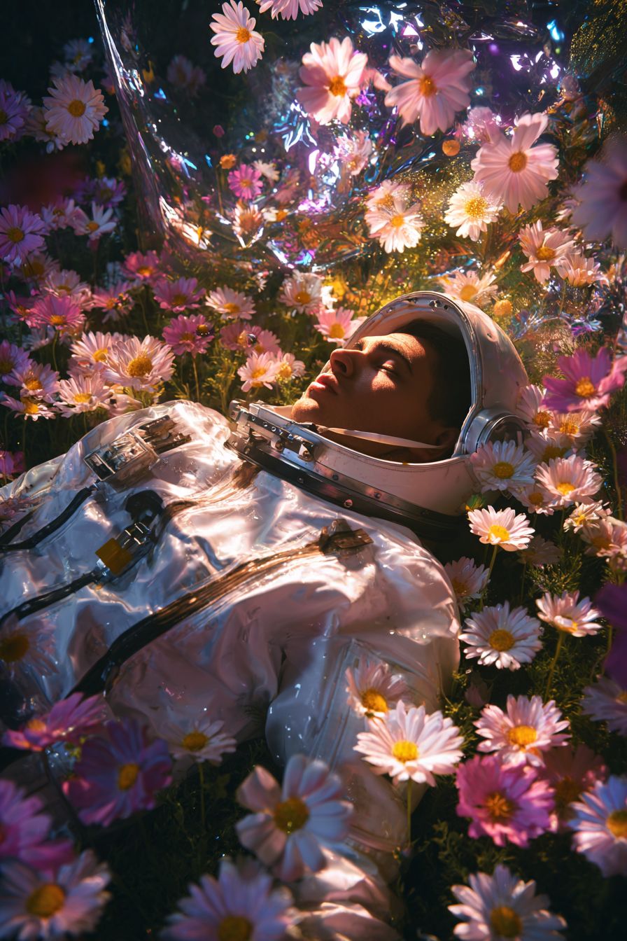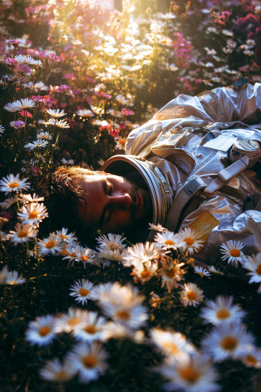 رائد فضاء مستلقٍ في حديقة من زهور الأقحوان