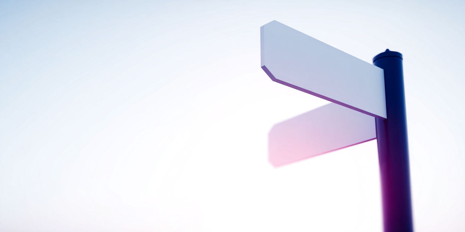 closeup Directional signpost with two arrows, decision making symbol, choice and strategy icon, minimalist composition, empty space --chaos 5 --ar 2:1 --raw --sref 8525297061 --profile mvy7von --stylize 75 --v 7.0