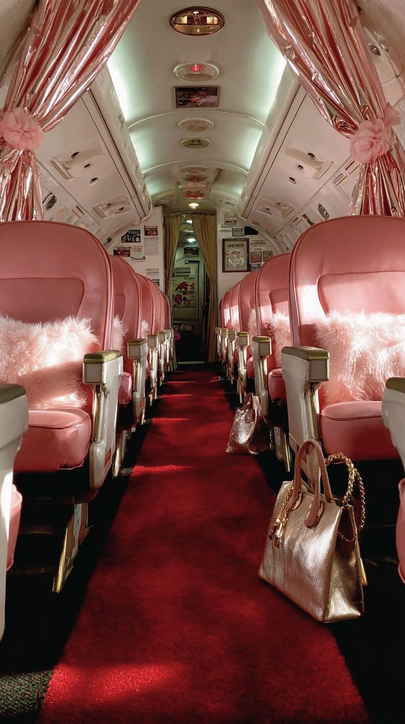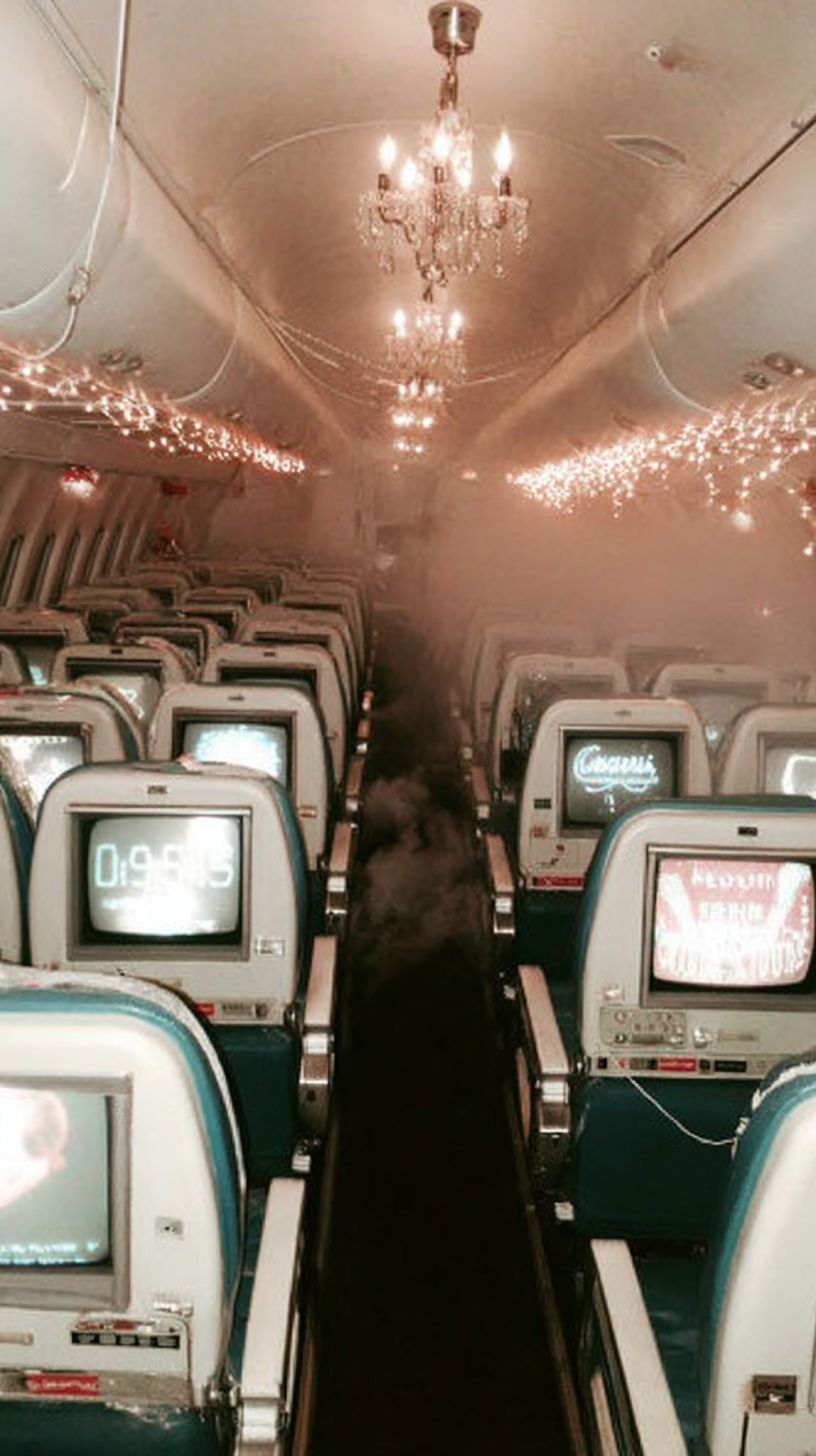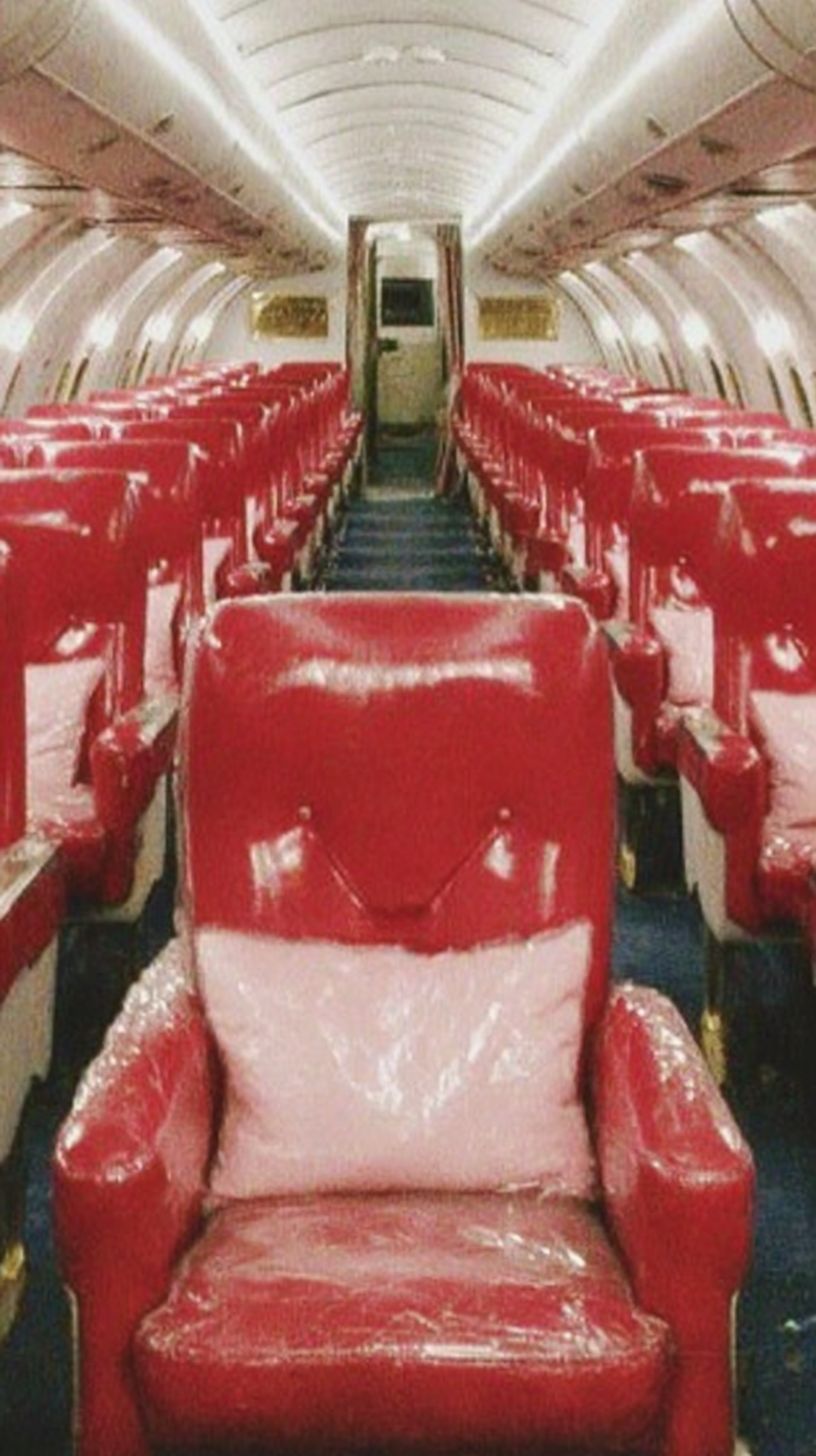صورة لقمرة طائرة على طراز الستينيات، الأضواء مطفأة، منظر من الممر، تأثير فيلم مغبر