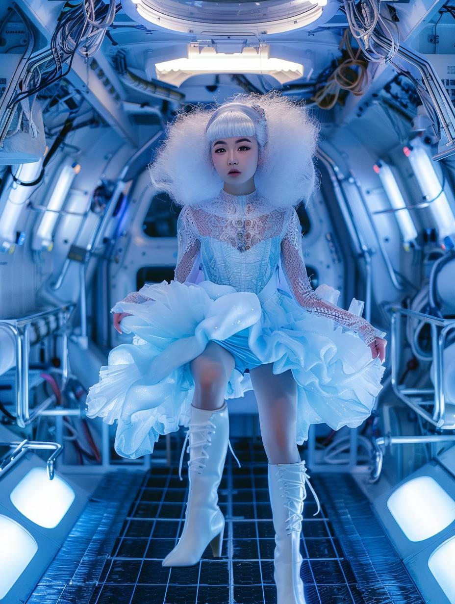 A photograph of an Asian woman with white hair, a puffy, curly, cloud-like hairstyle, wearing an ice blue dress and boots, inside a spaceship with intricate lighting. --ar 3:4 --v 6.0 --style raw