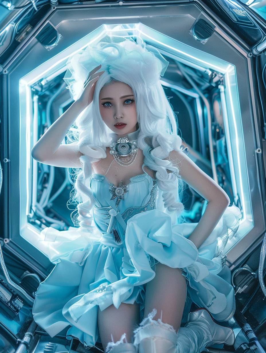 صورة لامرأة آسيوية ذات شعر أبيض، بتسريحة شعر منتفخة ومجعدة، ترتدي فستاناً أزرق مثلجاً وحذاءً، داخل مركبة فضائية مع إضاءة معقدة.