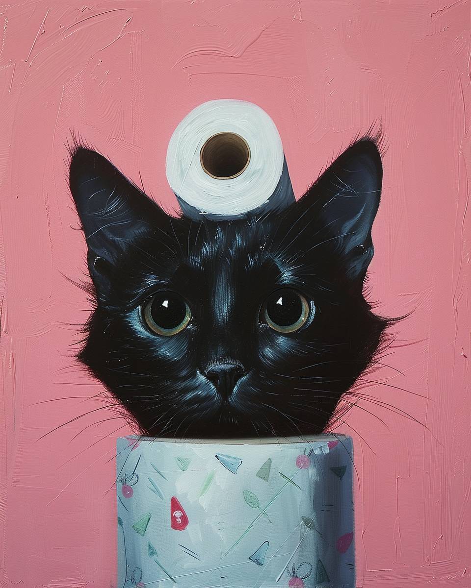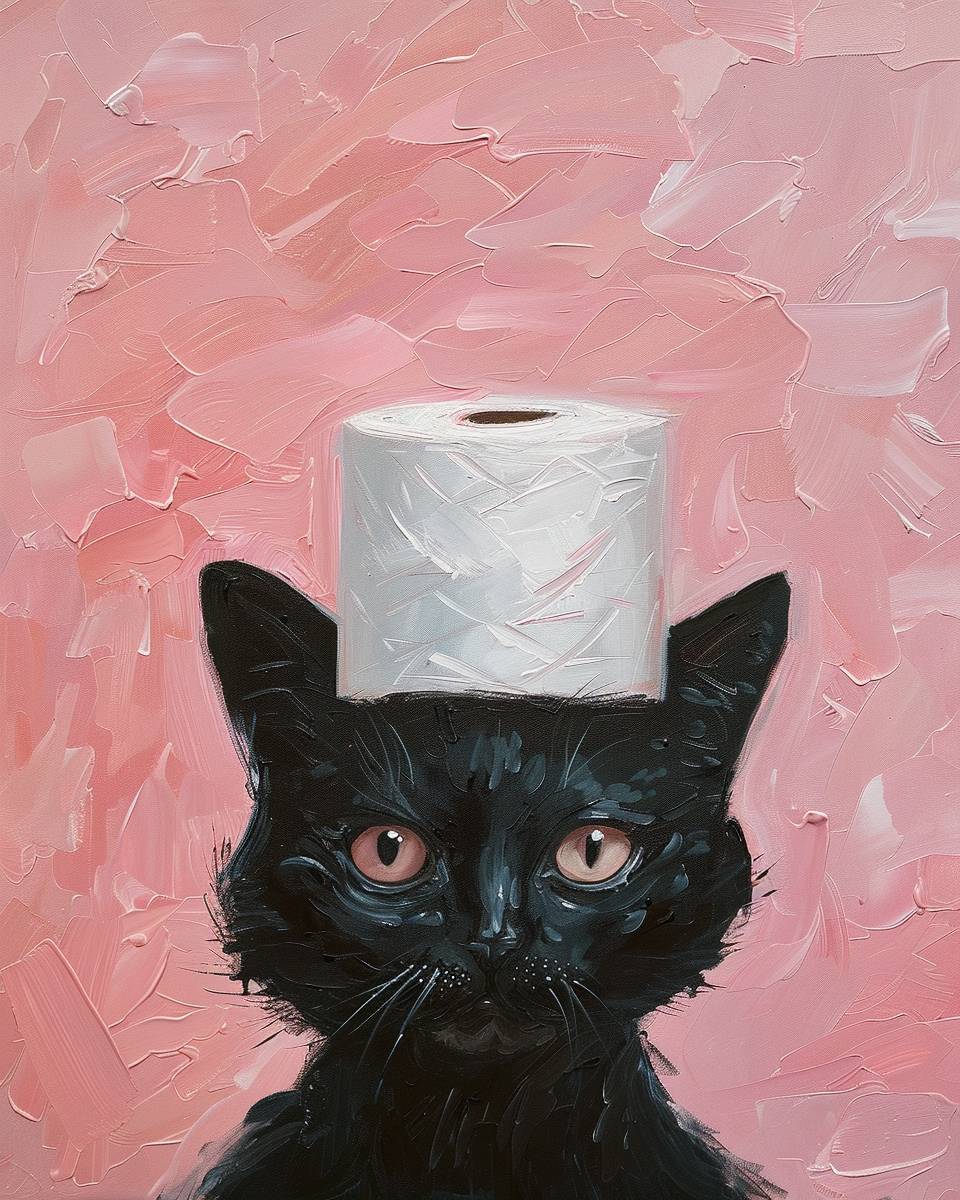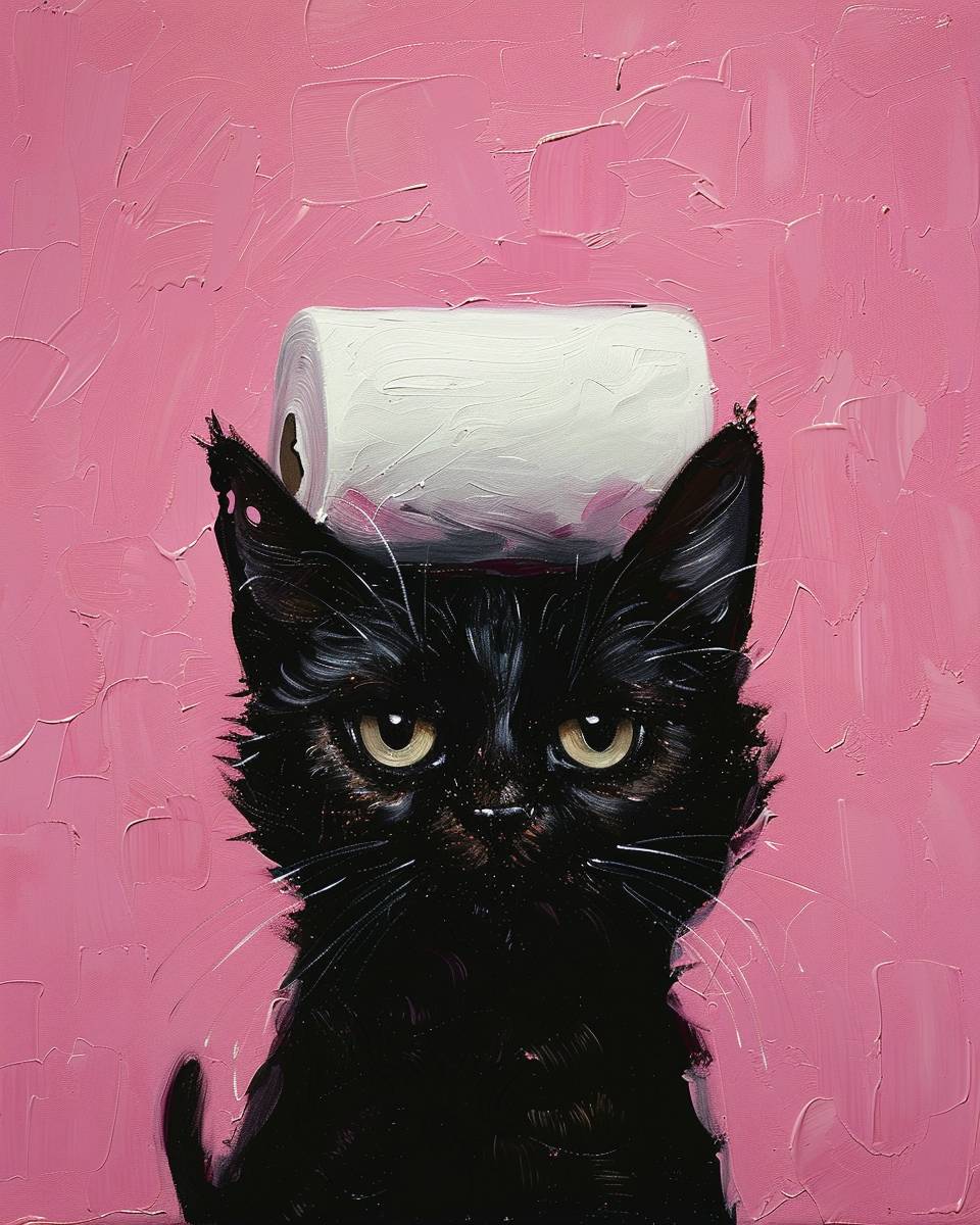 لوحة زيتية ناعمة تظهر قطة سوداء تتطلع من أسفل مع لفة ورق تواليت على رأسها، على خلفية وردية.