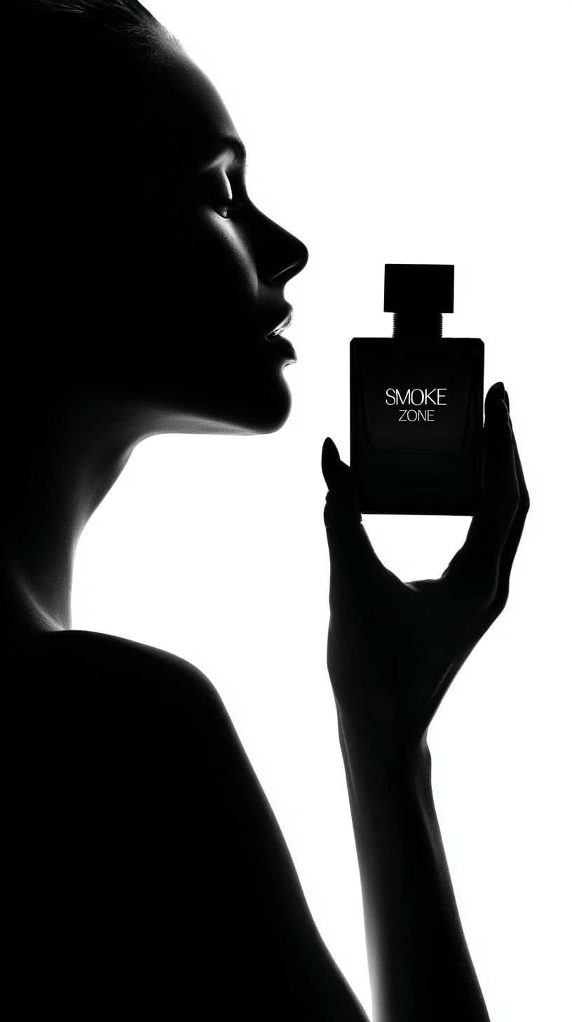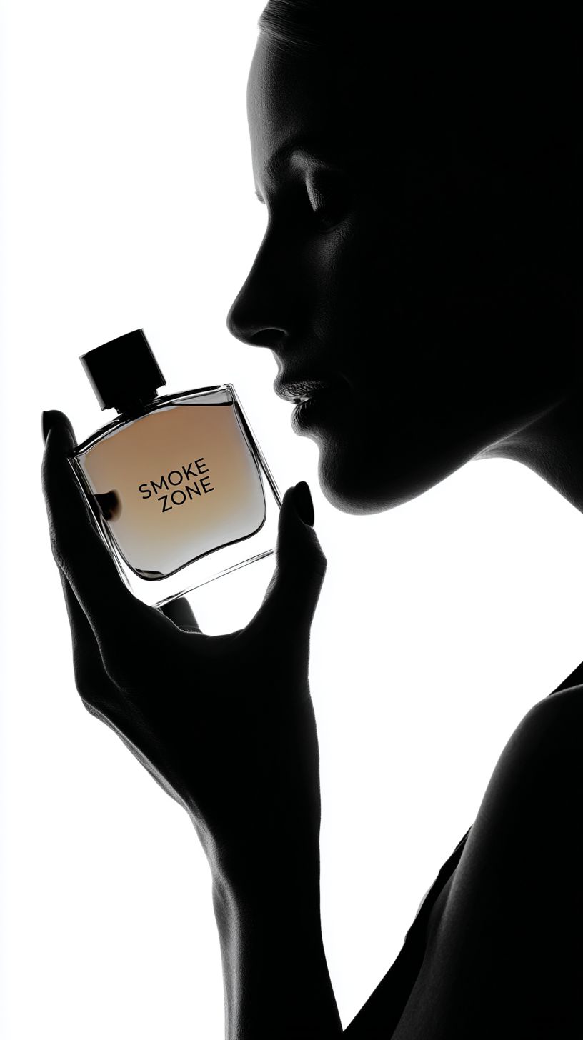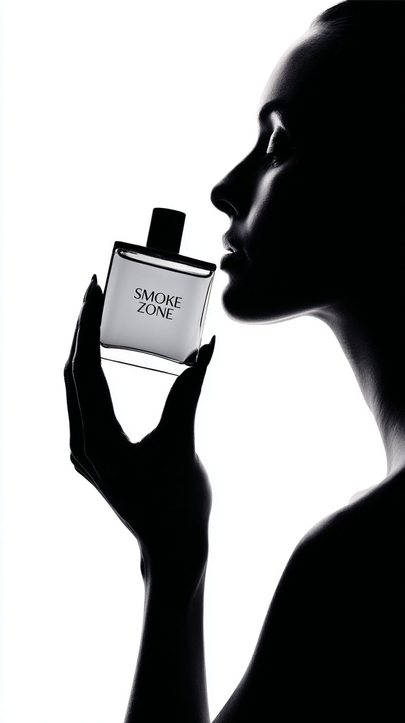 امرأة تحمل زجاجة عطر 'SMOKE ZONE' بالقرب من وجهها. تم التقاط صورة ظلية الزجاجة، التي تحملها يد عارضة جميلة، في تصوير عالي الدقة، مما يعرض تصميمها الأنيق وشكلها الأنيق. هذه صورة استوديو احترافية بخلفية بيضاء، وتركيز حاد، وتفاصيل عالية.