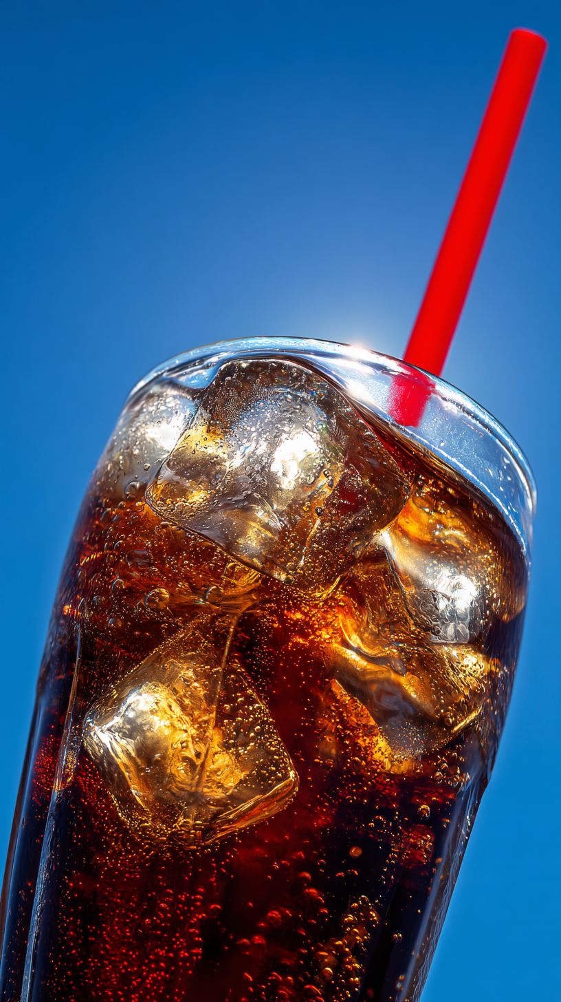 Outdoor in the north, close-up of a cola glass bottle, blue sky without white clouds, with a red straw inserted, looking through the sun to see the ice cubes and cola liquid inside. The texture details of the ice cubes are super realistic, commercial photography --ar 9:16 --s 50 --raw