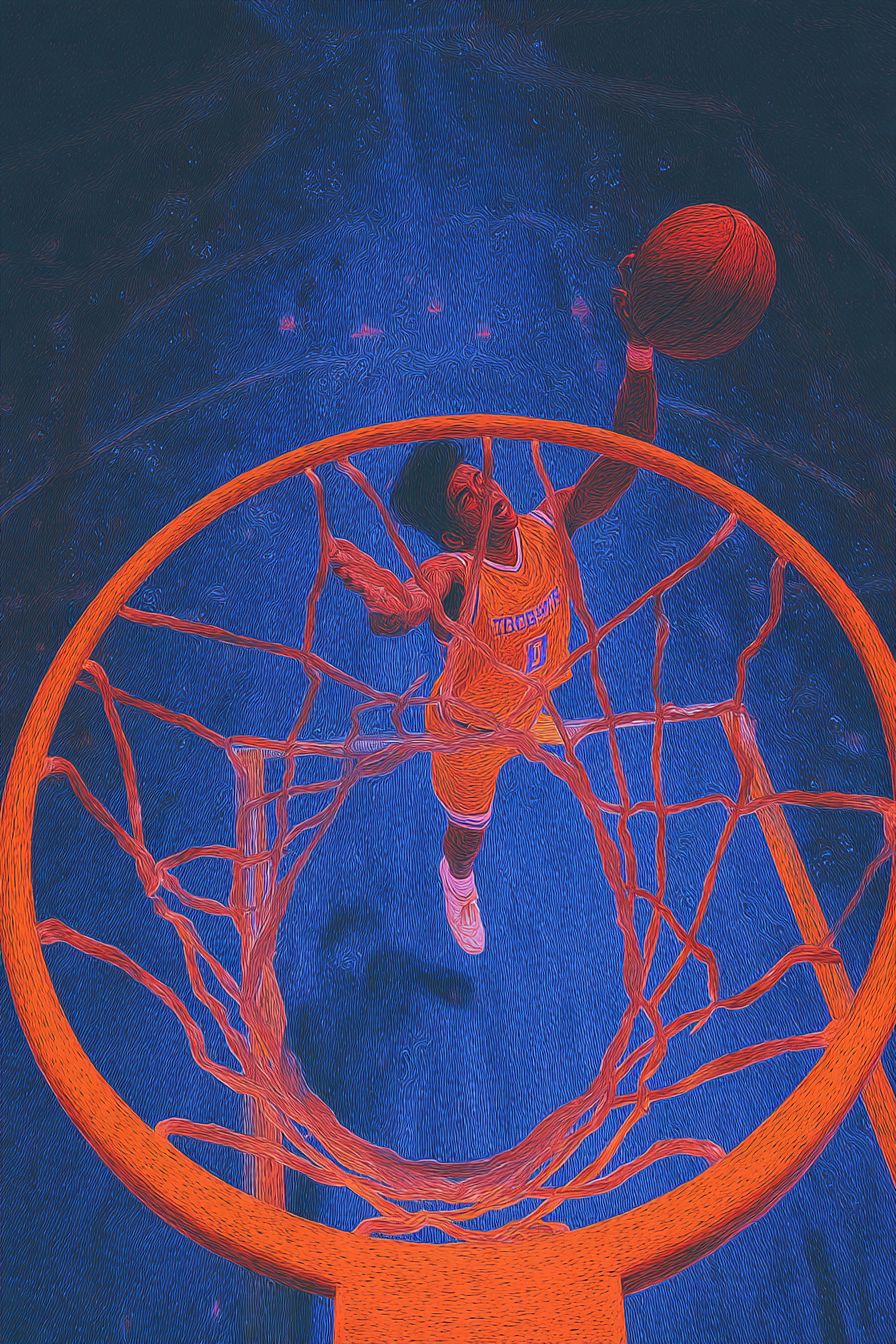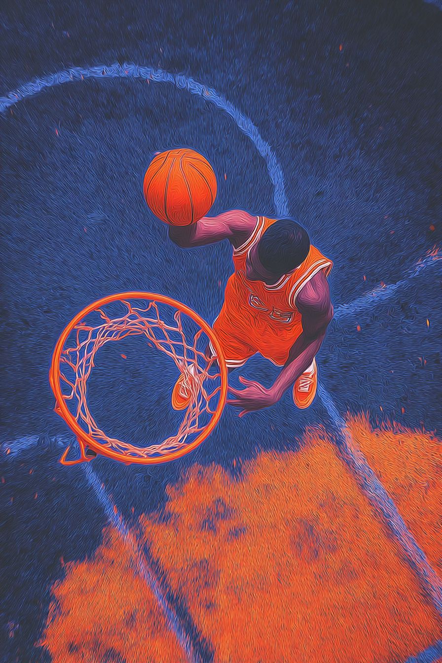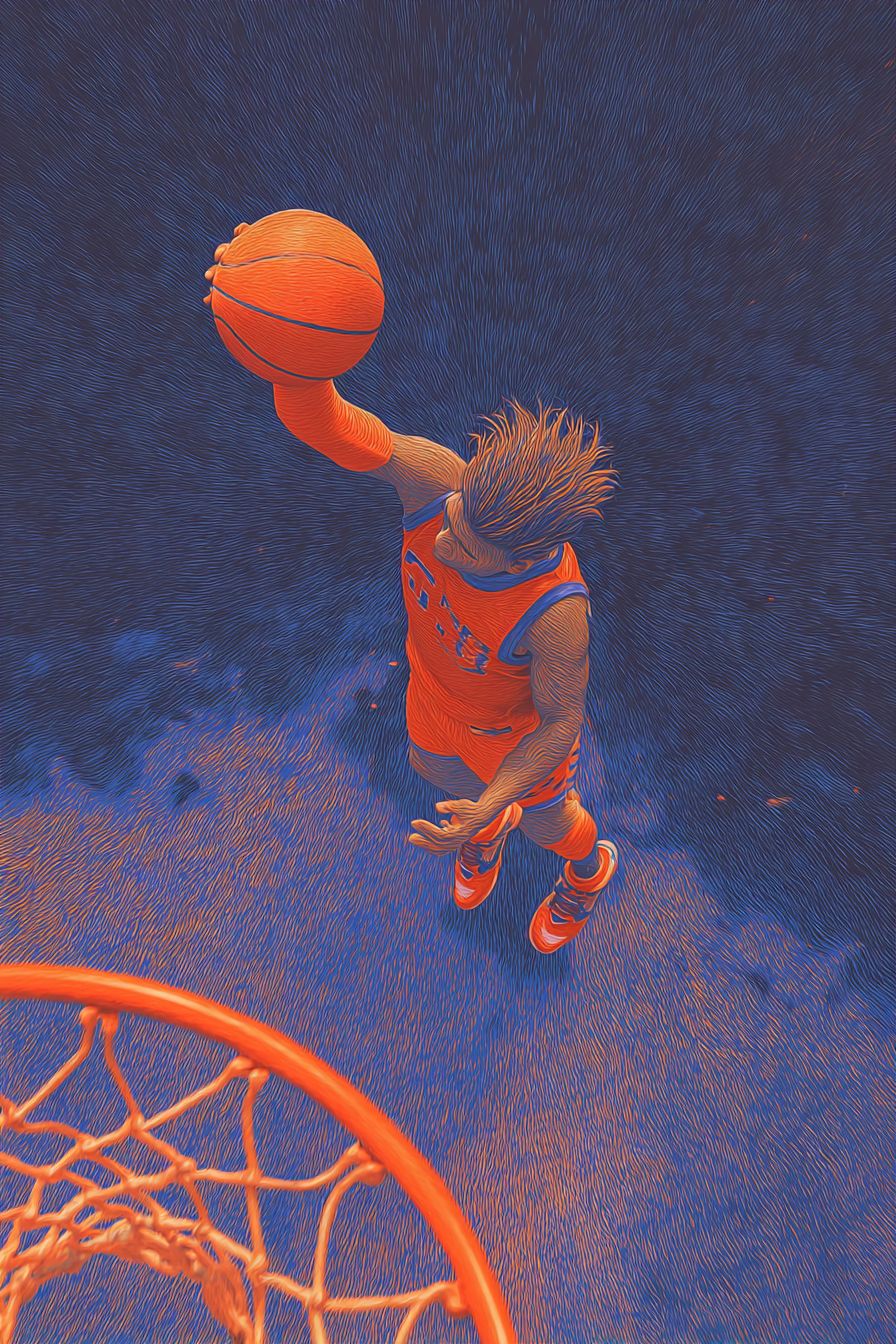 A basketball player doing a slam dunk, action shot, view from below --ar 2:3 --sref 2292898389 --s 50 --raw