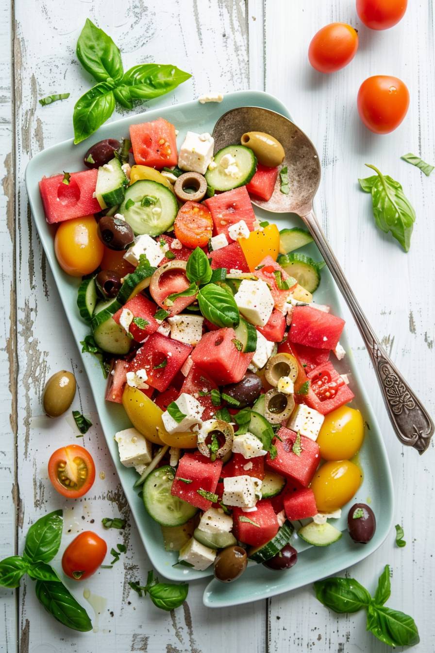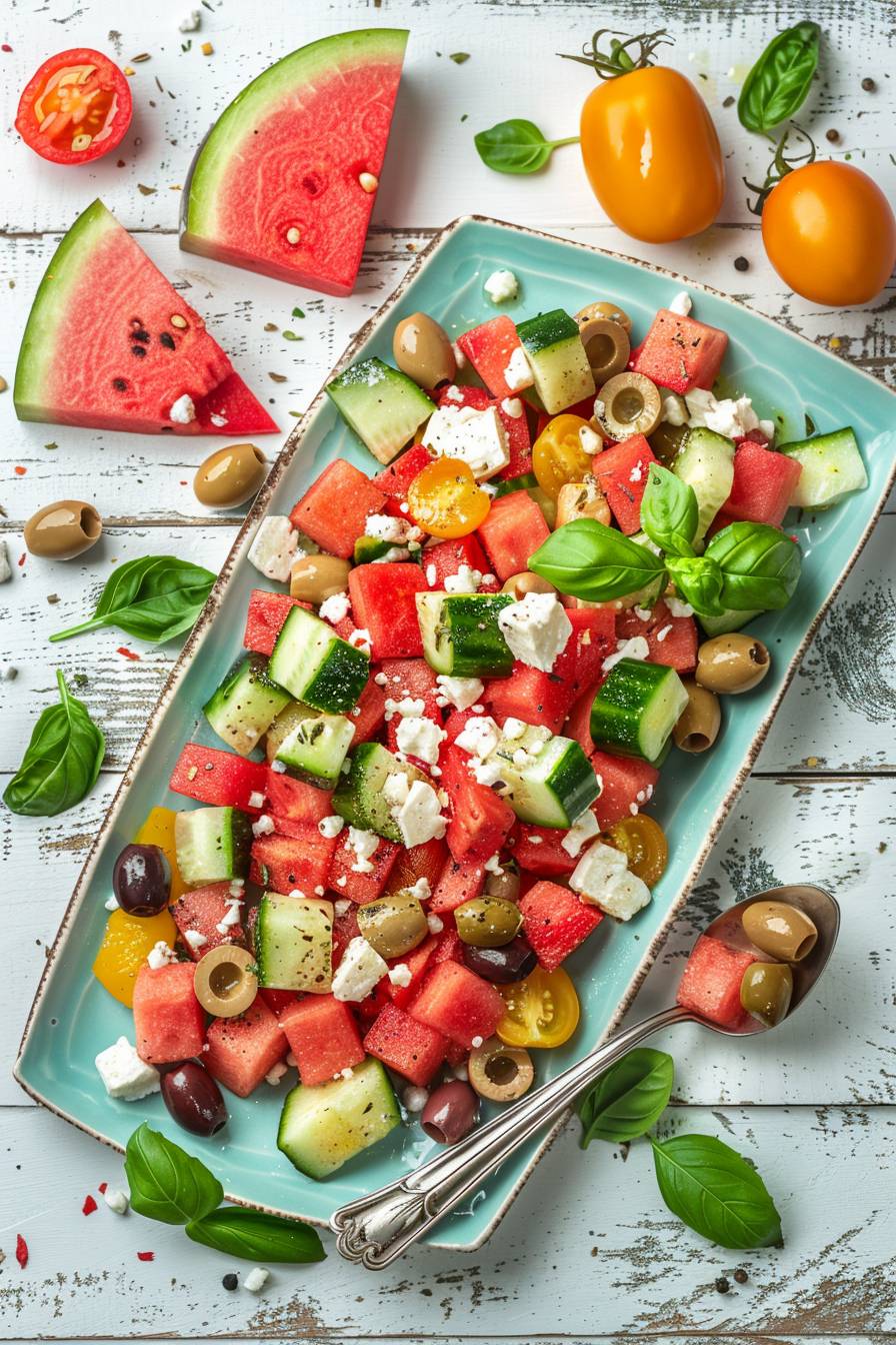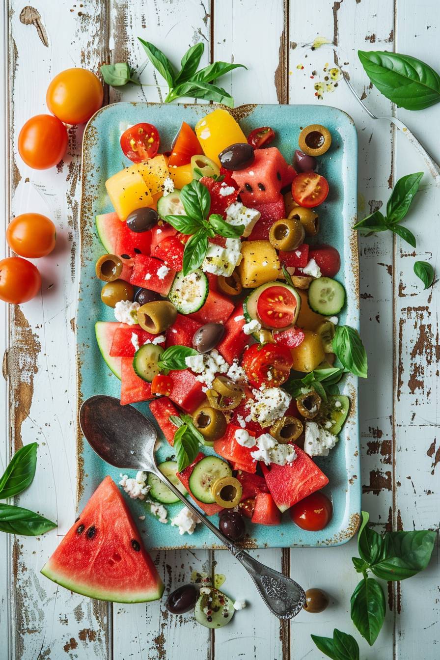 A vibrant watermelon salad with feta, cucumber and olives on an old white wooden table. The colorful mix of reds from the Watermelons contrasted against green leaves of basil for depth, with two small yellow tomatoes adding to its visual appeal. A large spoon is placed next to it on top of a light blue rectangular plate, with some pieces scattered around. On one side, there's a slice of fresh pink melon in view. Captured by professional food photographer using Nikon D850 camera and nikon AFS NIKKOR 2470mm lens at F/3.6 aperture --ar 85:128 --v 6.0
