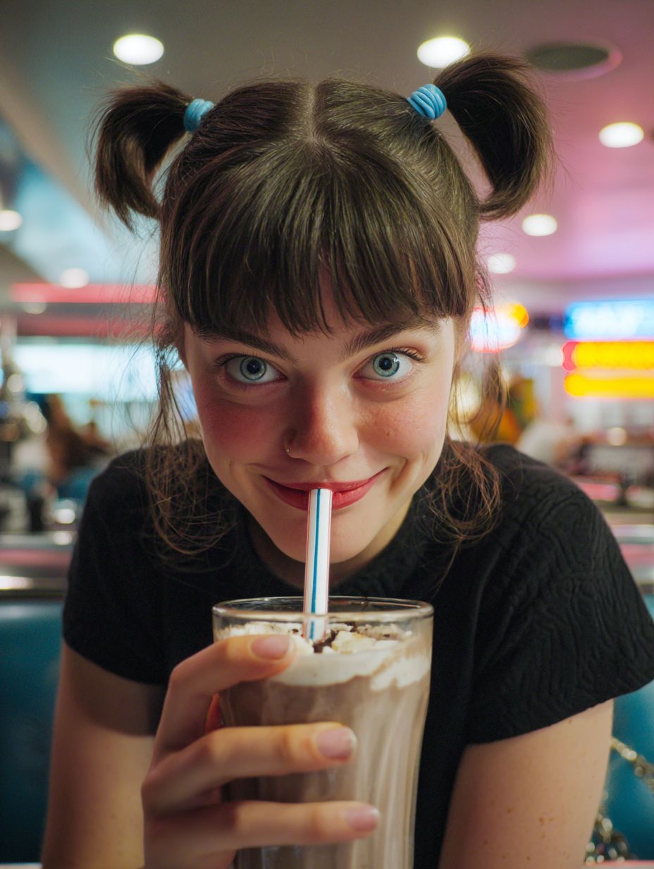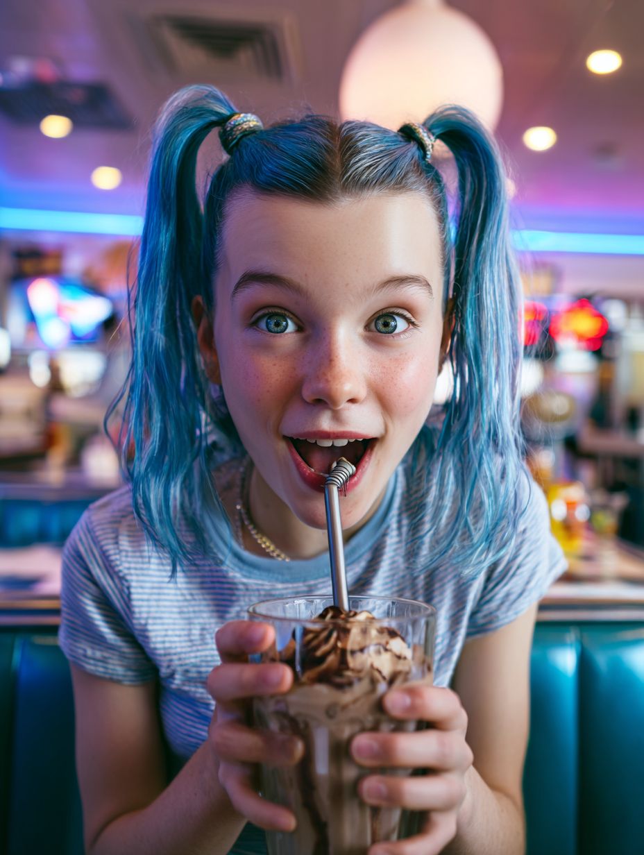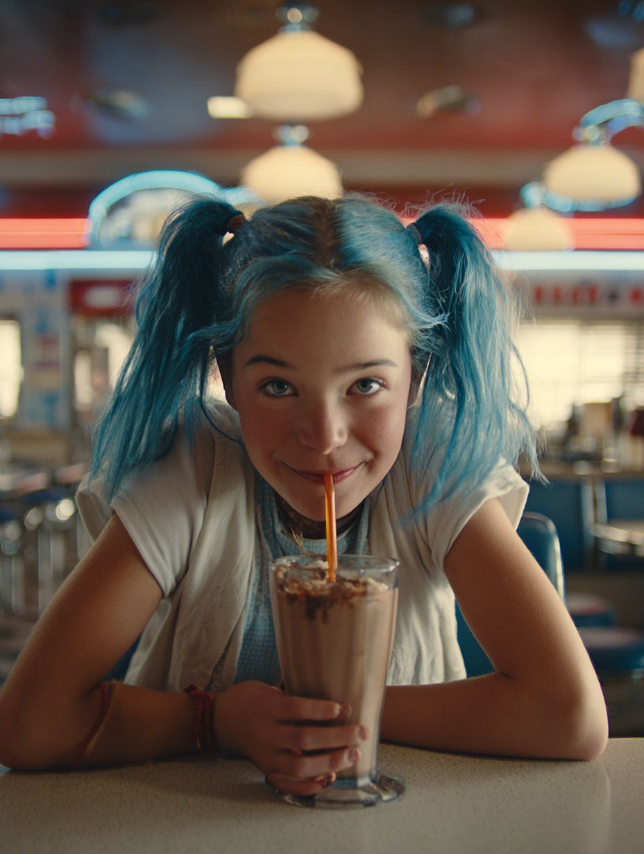 A front-facing, counter-level cinematic shot of a young teenager with bright blue ponytails and large expressive gray eyes, joyfully sipping a chocolate malt through a straw. Subtle motion in the scene: the straw slightly bending, a swirl forming in the milkshake, loose strands of hair gently bouncing, and light reflections shimmering on the glass. The teen’s expression conveys pure happiness and carefree enjoyment. An old-fashioned American diner fills the background--chrome details, vinyl stools, neon signage softly glowing--with a shallow depth of field. kodak portra 400 color palette,ultra-detailed, high realism, cinematic photography. --ar 3:4 --raw --s 50 --v 7.0