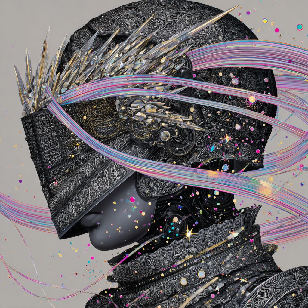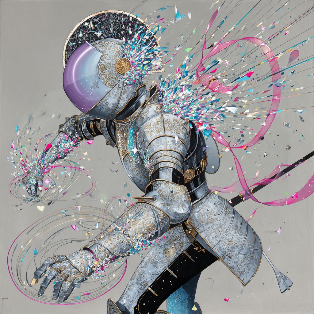 فارس في درع الأونيكس العاكس يطفو، وخوذته تتفكك إلى شظايا قوس قزح حادة. تسرب القفازات دوامات متلألئة من الطاقة تتجه إلى الخارج. تتناثر قطع البرايزما عبر الدرع المزخرف برموز فركتالية. تتداخل أشرطة مادة هولوجرافية مجرّدة في الهواء. الخلفية الرمادية الناعمة تعزز الفوضى المتألقة.