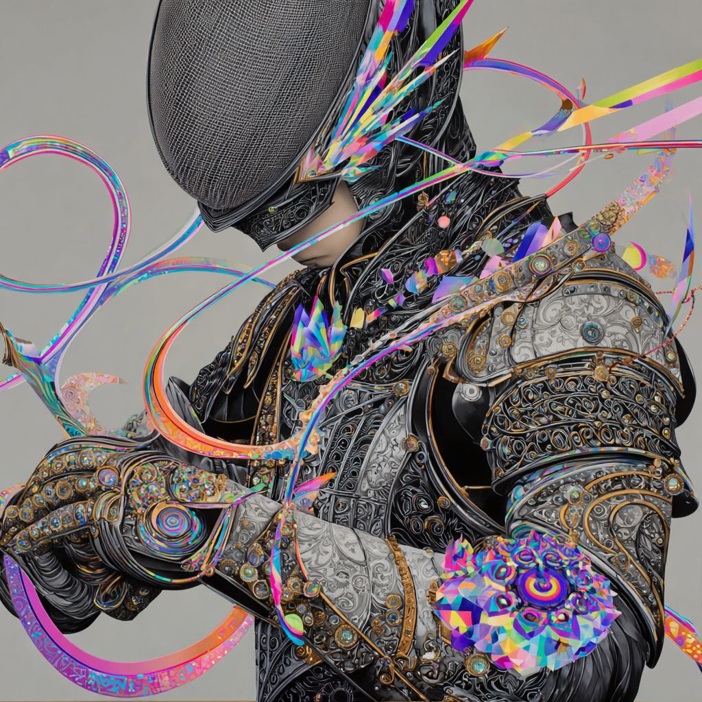 A knight in reflective onyx armor levitates, helm fractalizing into sharp rainbow shards. Gauntlets exude glowing spirals of energy that float outward. Prism fragments scatter across armor adorned with fractal glyphs. Abstract ribbons of holographic material braid through the air. Background of soft gray amplifies the luminous chaos. --profile bpl24t7 --s 50 --v 7.0