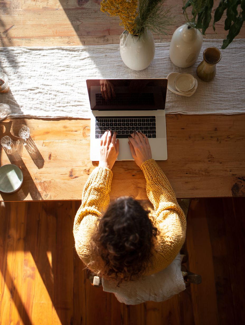 A realistic overhead top-down shot of a 30-year-old woman wearing a subtle yellow sweater, sitting at the dining table of her bright and cozy home, actively typing on her laptop with both hands on the keyboard, the dining table made of warm natural wood, surrounded by soft home details like a small plant, light-colored ceramics, and a linen table runner, abundant natural daylight flooding the space from a nearby window, creating a fresh and welcoming atmosphere, the scene feels calm, comfortable, and full of gentle focus, shot with a Canon EOS R6, 35mm lens, crisp details with natural depth, color grading in warm luminous tones with subtle #ffcb20 highlights reflected throughout the scene --ar 3:4 --raw --s 50 --v 7.0