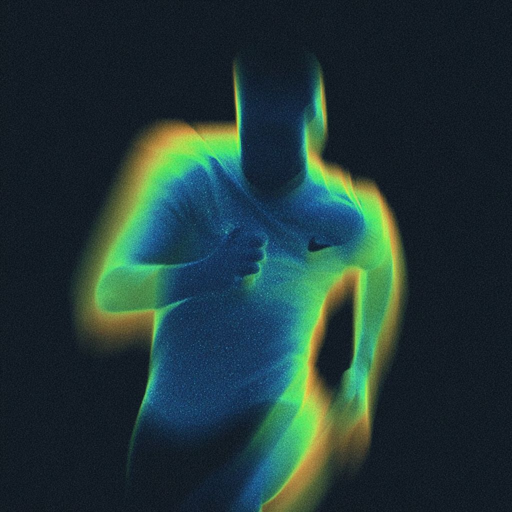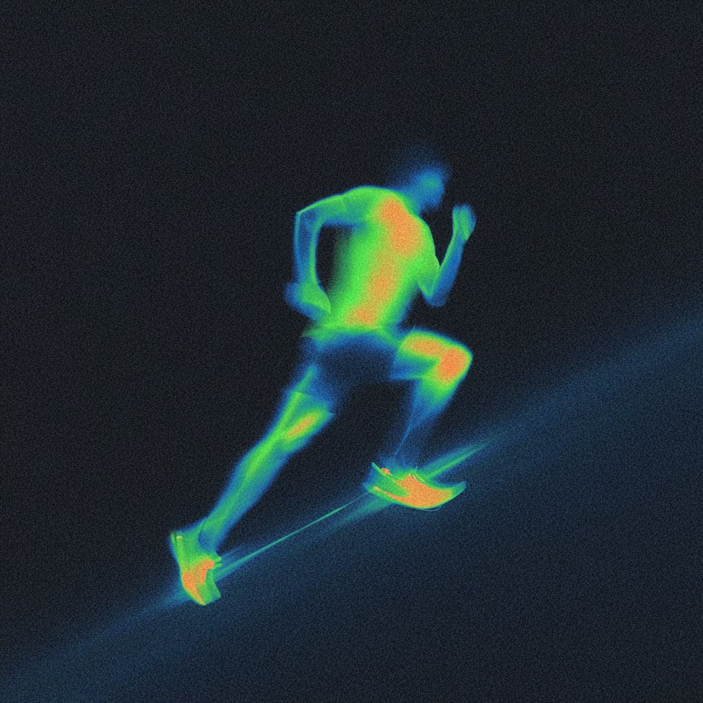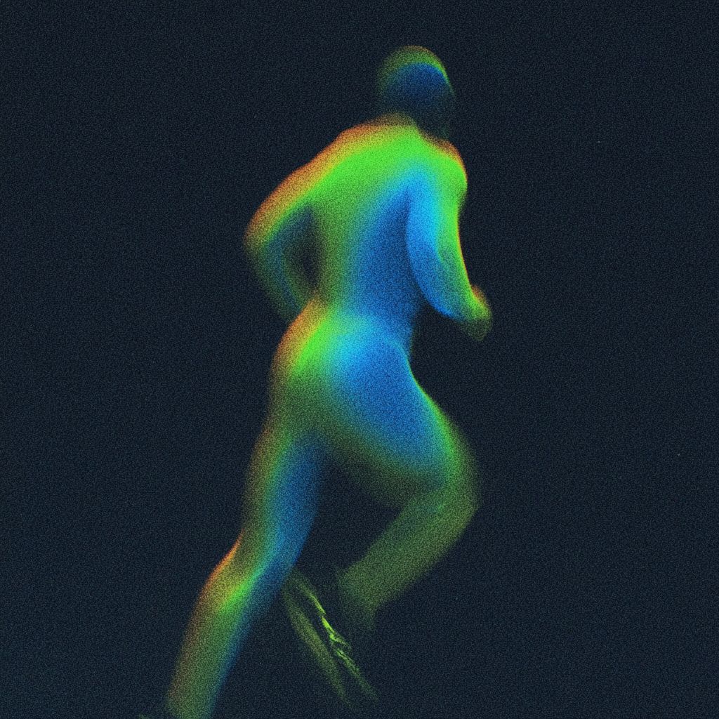 صورة رياضية مجرّدة عالية التباين لعداء، للجسم بالكامل، تم التقاطها في منتصف الحركة. تشوش ضباب الحركة الطويلة المدى والرسم الرقمي المقصود الذي يحجب الرأس والجزء العلوي من الجسم، تم حذف الوجه بالكامل ولا يمكن التعرف عليه. توهج ناعم حول الموضوع، تأثيرات غير واضحة، بيئة بسيطة للغاية بدون دلائل عمق مرئية. تصوير رياضي تحريري مفاهيمي، يتم التأكيد على الحركة بدلاً من الهوية.