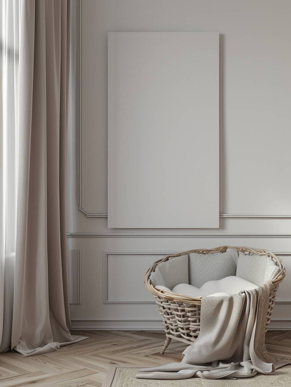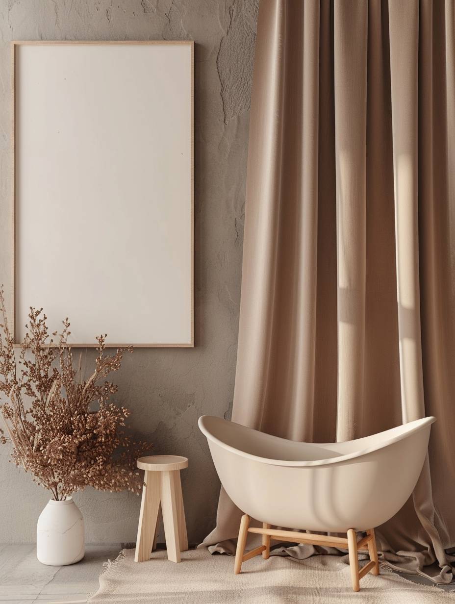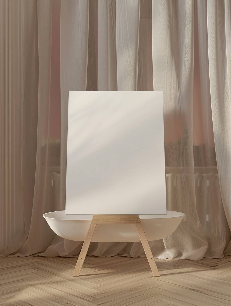 3d illustration of an enlarged blank poster. on the side of the enlarged blank poser there should be a side view of a baby bassinet. a simple and sleek design. curtains should be on the side in the background. baby pink color tones. 3d rendering. 4k --ar 3:4 --v 6.0