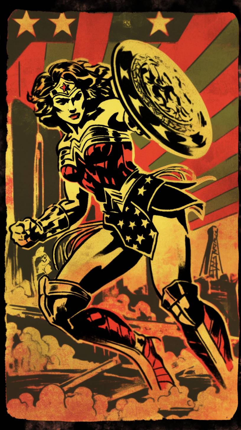 المرأة المعجزة مصورة بأسلوب فرانك فرازيتا، تمزج بين كوميديا مارفل وال illusions المذهلة، مع جمالية برية وجريئة، تعرض أزياء مفصلة وإتقان للضوء والظل.