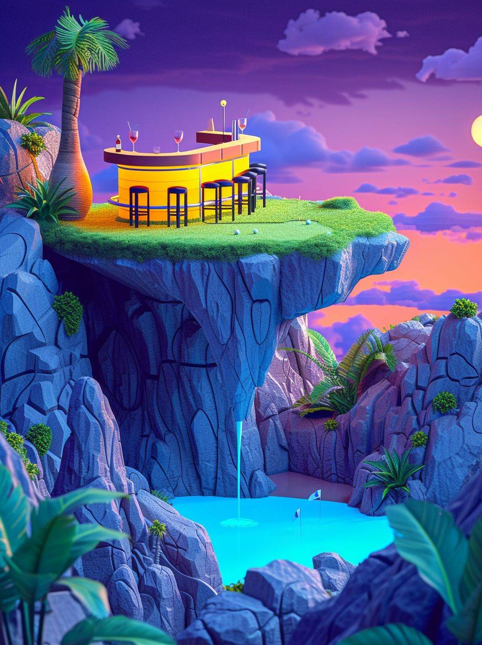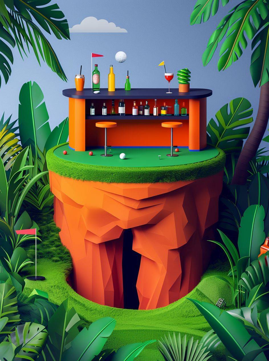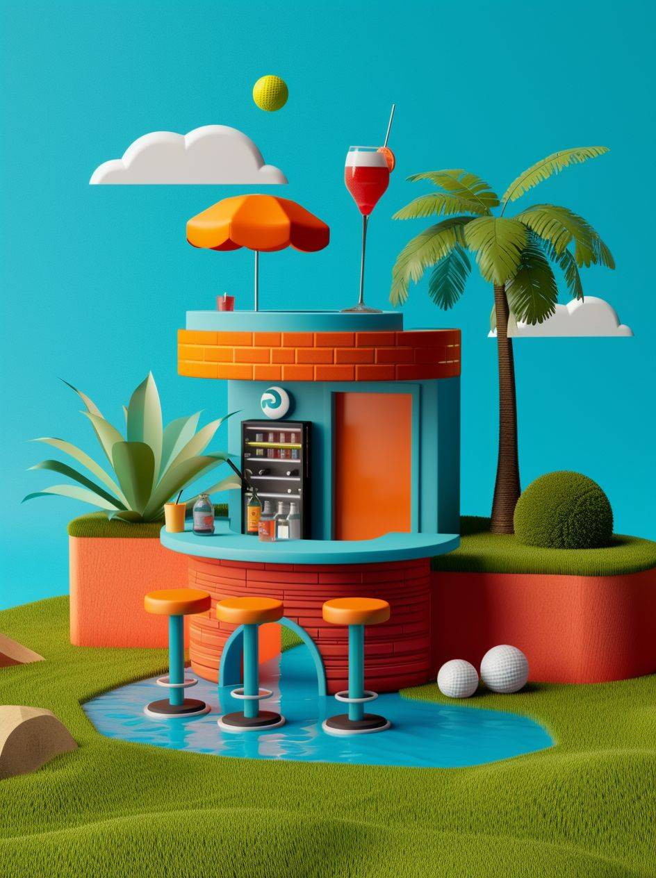 بار صغير يقع أعلى حفرة جولف، بأسلوب كرتوني وألوان زاهية.
