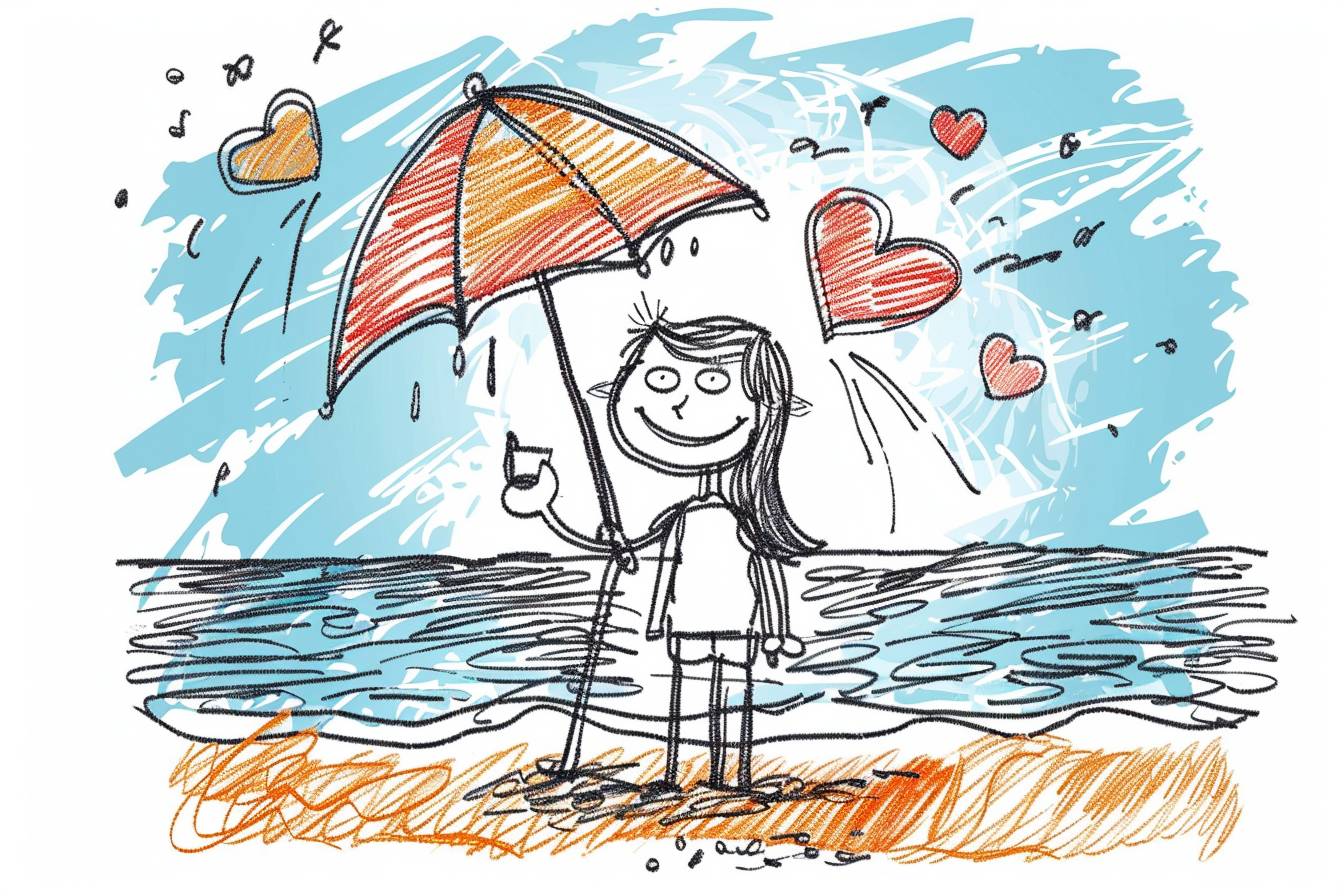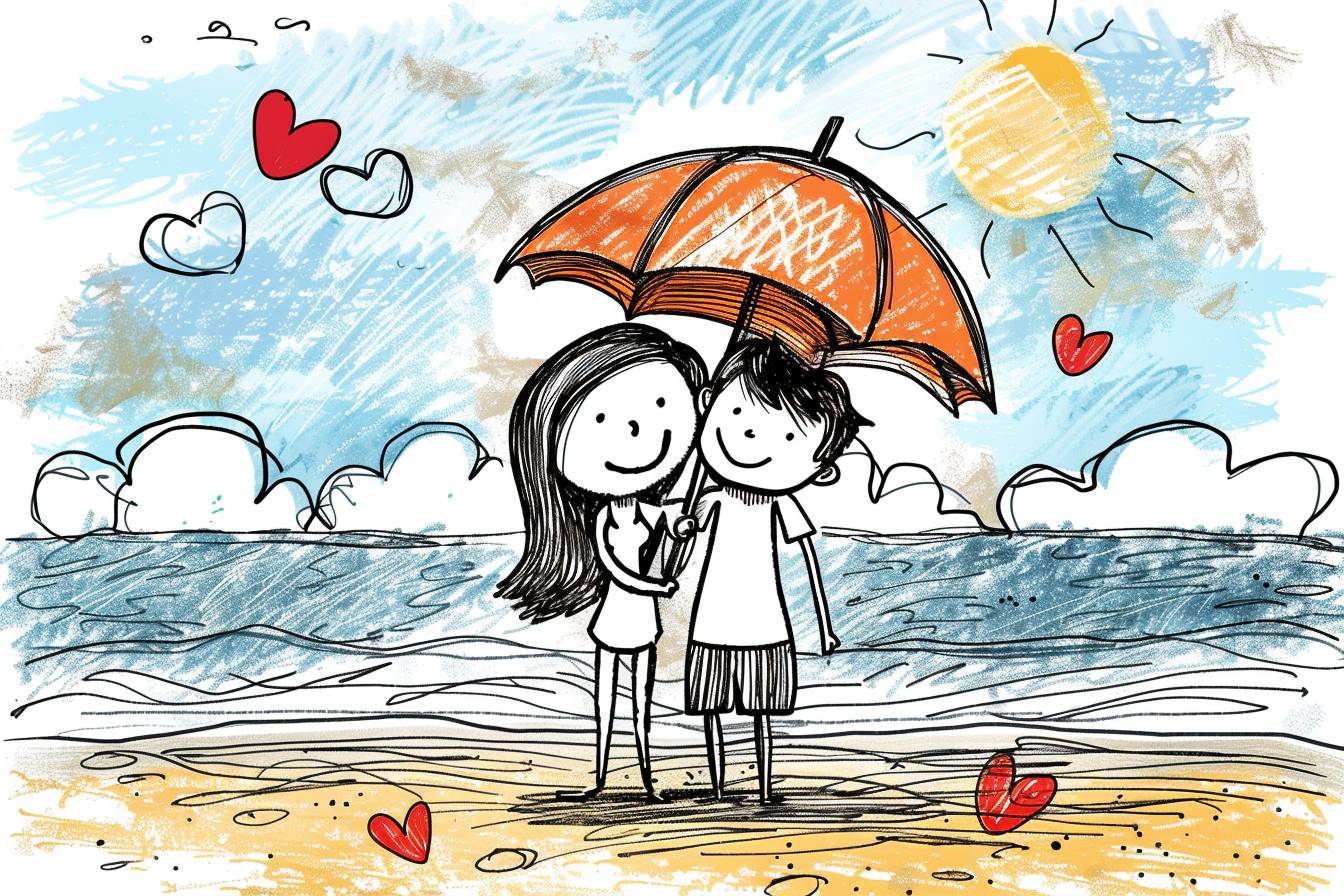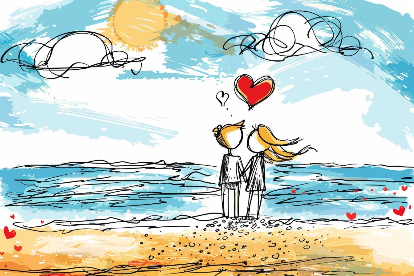 رسم يدوي بأسلوب كارتوني لشخصين يتعلمان على الشاطئ، مع قلوب، بتفاصيل عالية الجودة.