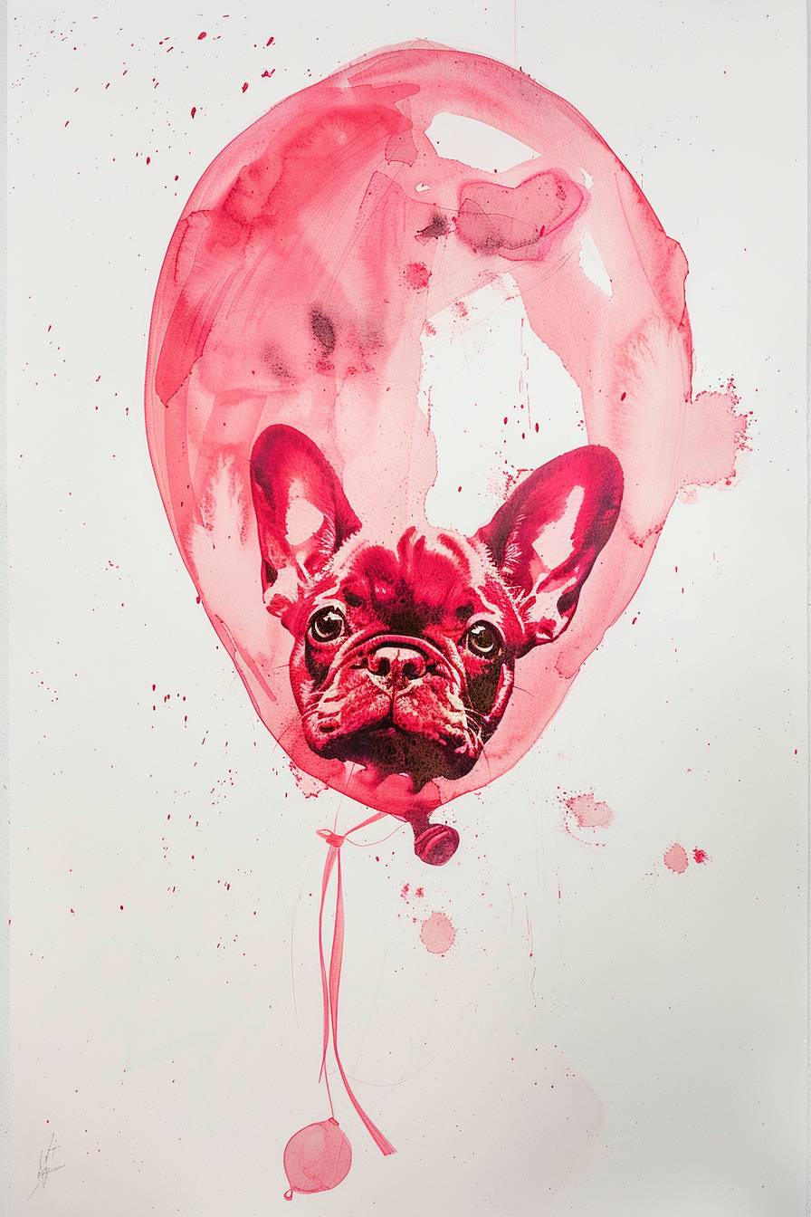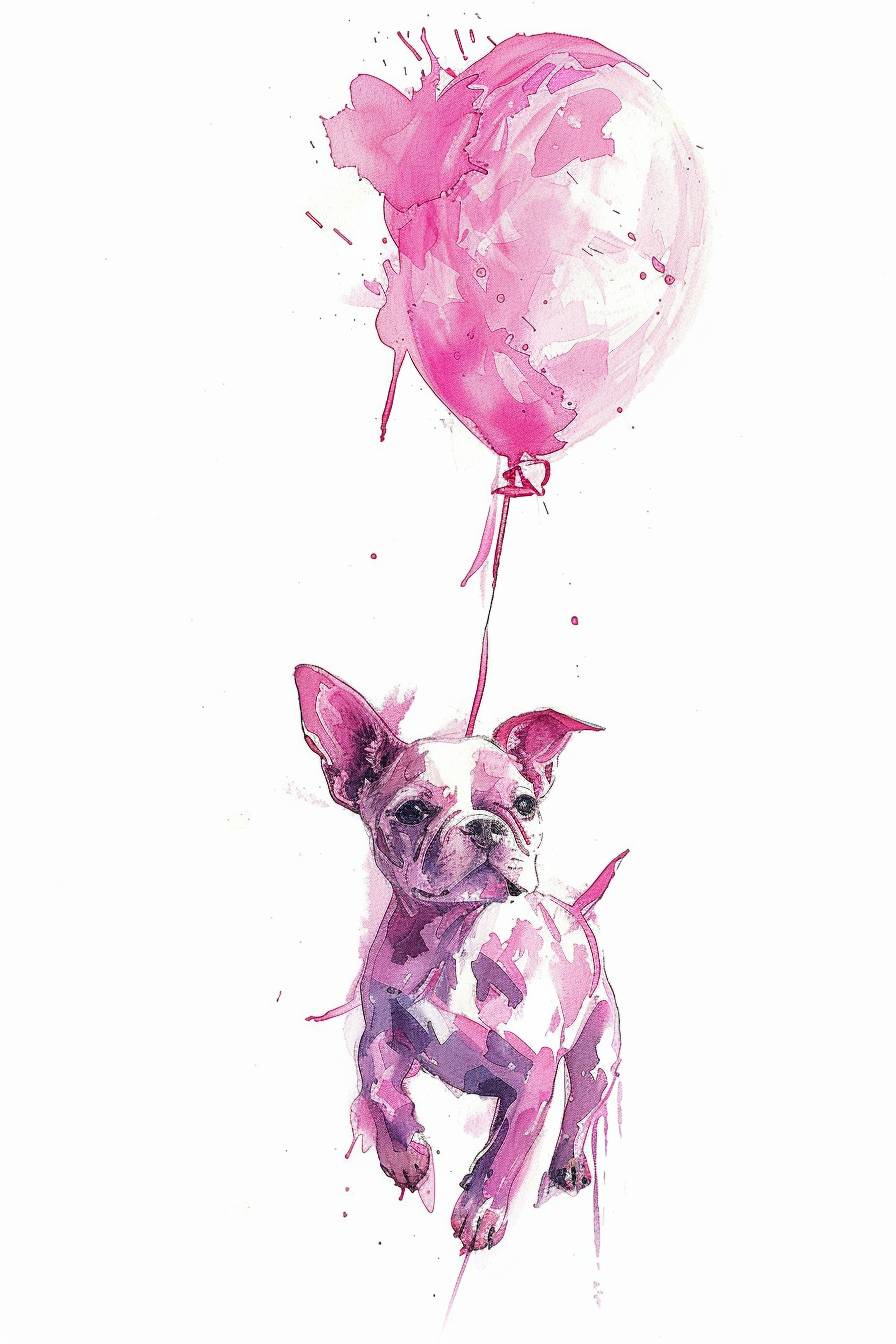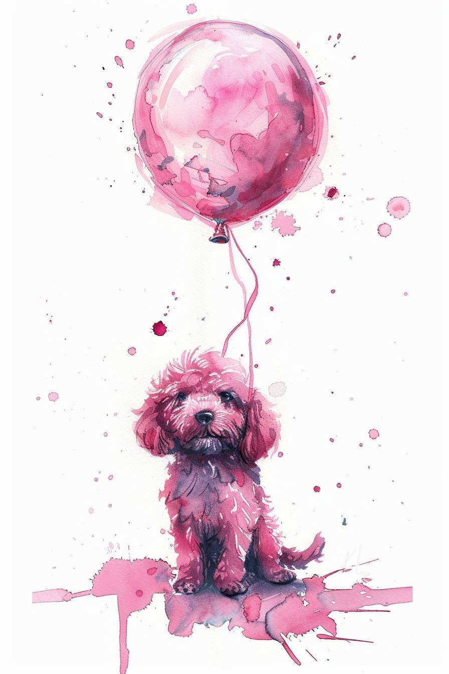 كلب بالون وردي لطيف باللون المائي، مضحك.