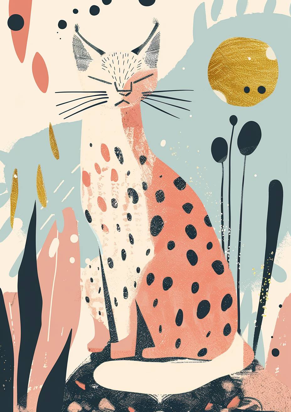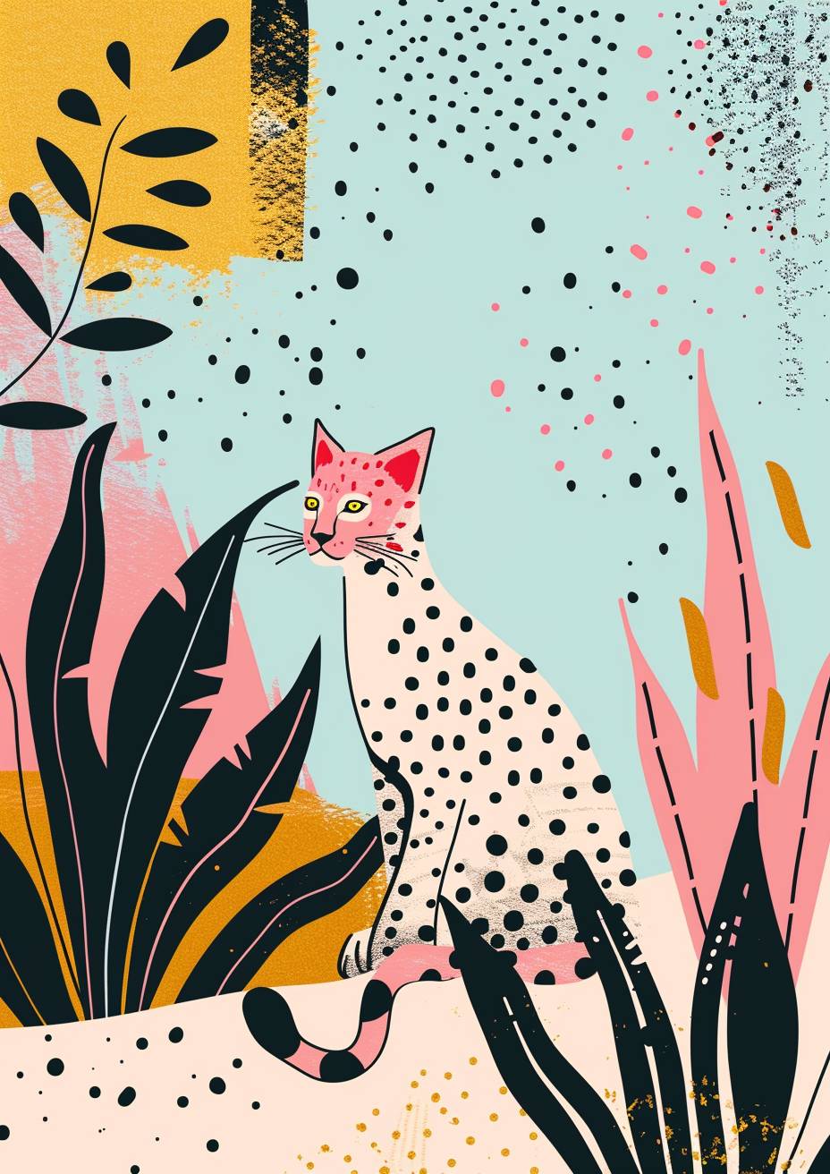 عرض رسومي غريب يركز على الوشق مع مخطط ألوان باستيلية جريئة.