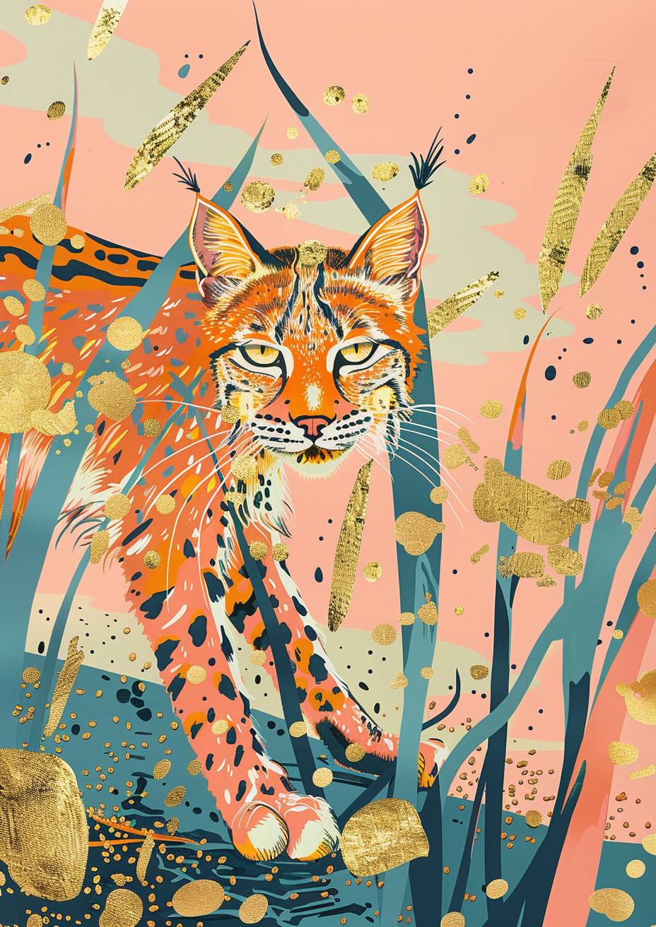 A minimal and whimsical illustration with a bold pastel color scheme; using marker art in the style of Matisse; inspired by I fall for you and aboriginal art; focusing on a lynx; the mood is playful and surrealistic. There is gold leaf all over the artwork. --ar 5:7 --v 6.0