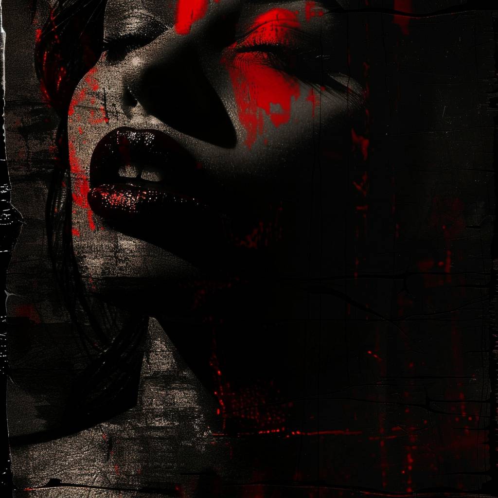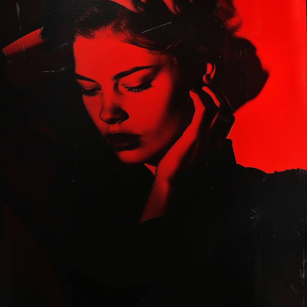 تصوير امرأة عصرية، بلا عنوان، في أسلوب الأسود والأحمر الداكن، ظلال متلألئة، تشكيل مسطح، لمعة عالية، صورة ذاتية، تفاصيل عالية