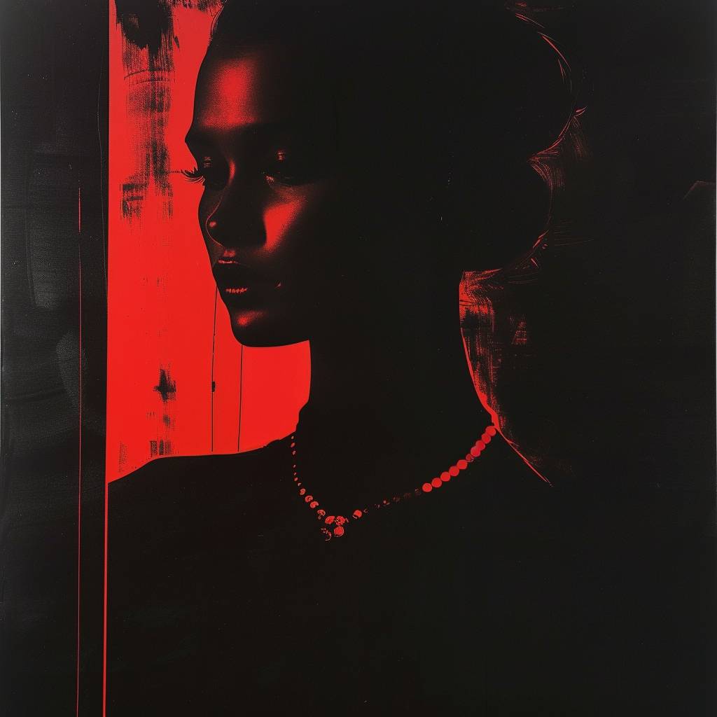 Fashionable woman photography,untitled,in the style of dark black and red, luminous shadows, flat figuration, high gloss, self-portrait, high detail--ar 2:3 --v 6.0