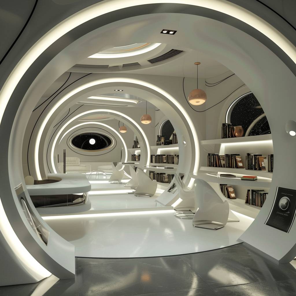 تصميم قاعة معرض بموضوع القراءة، بأسلوب خيال علمي، مع استخدام عناصر دائرية.