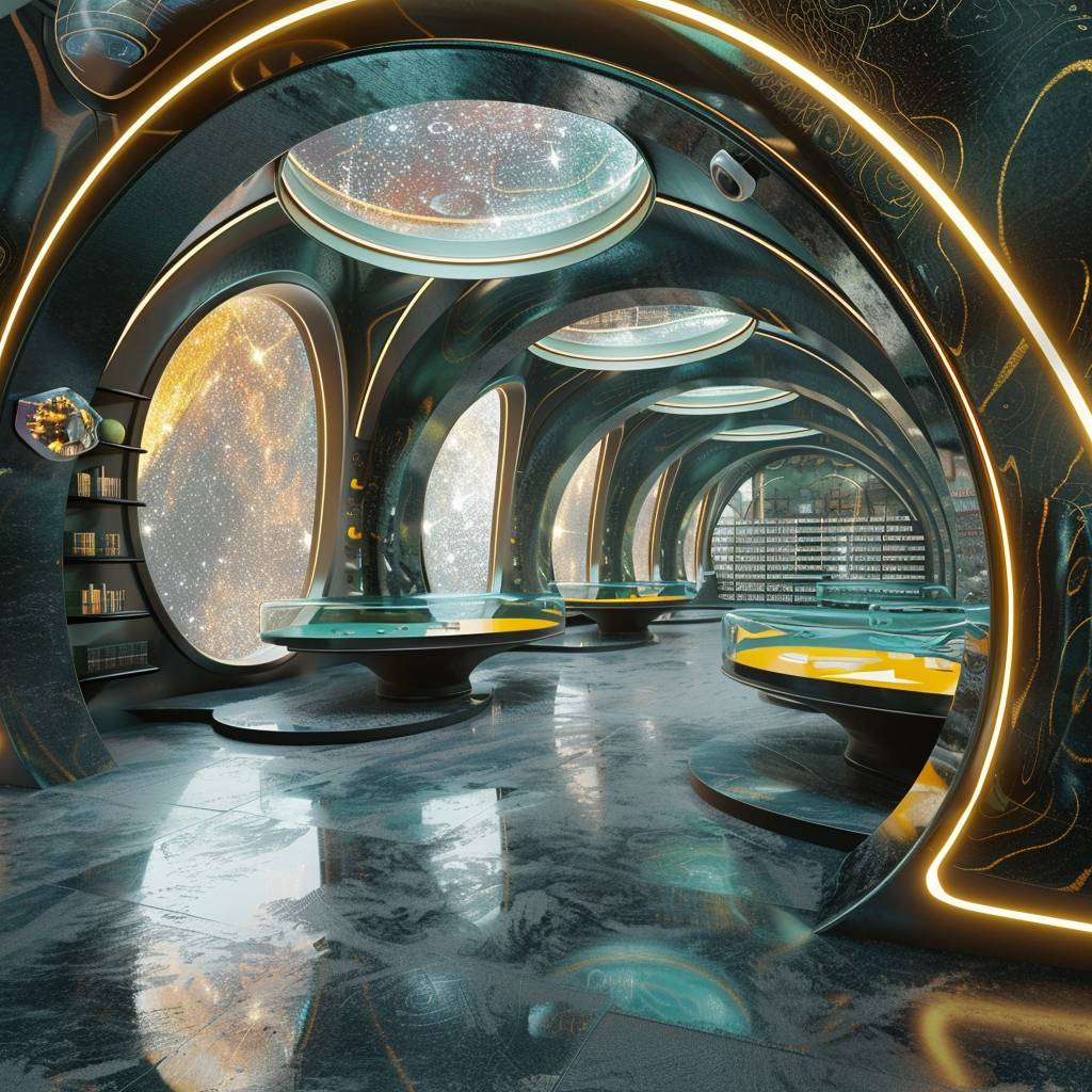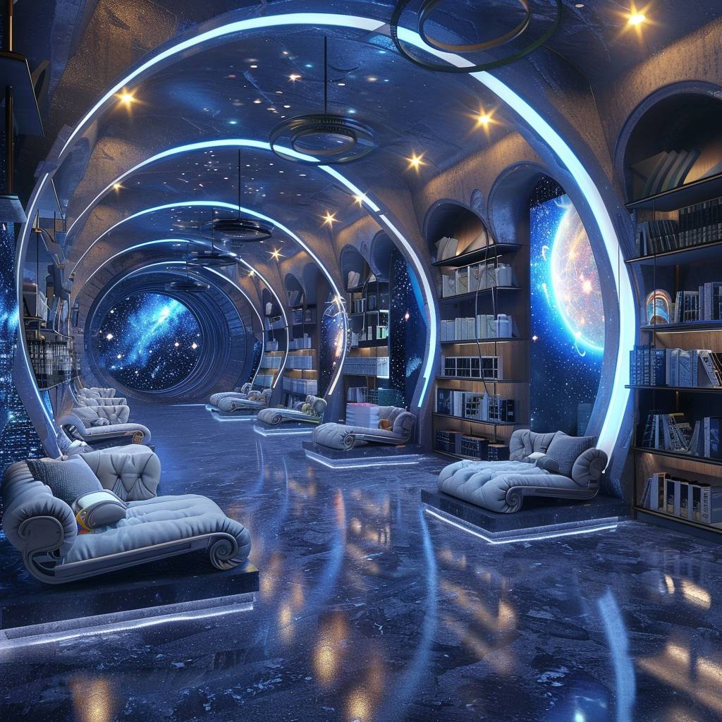 Design an exhibition hall with the theme of reading, a reading room, several booths, science fiction style, using circular elements --v 6.0