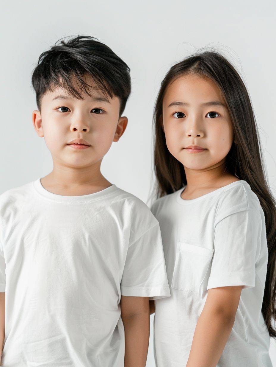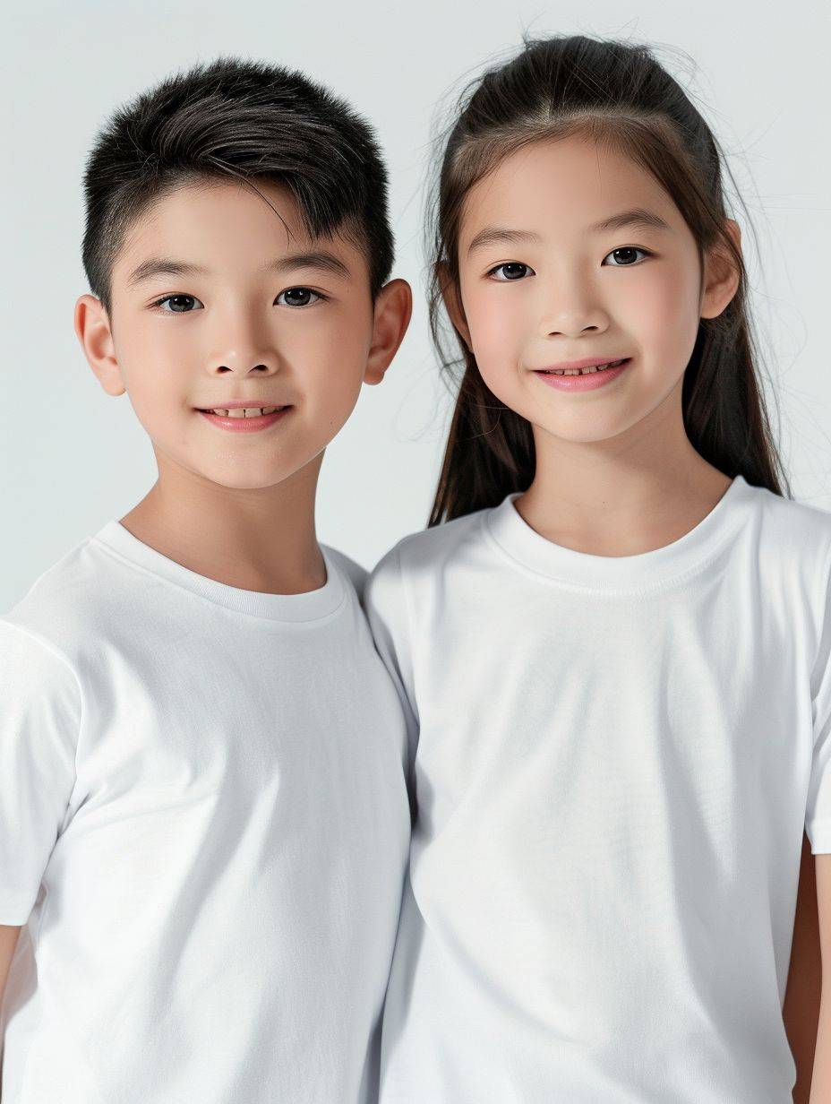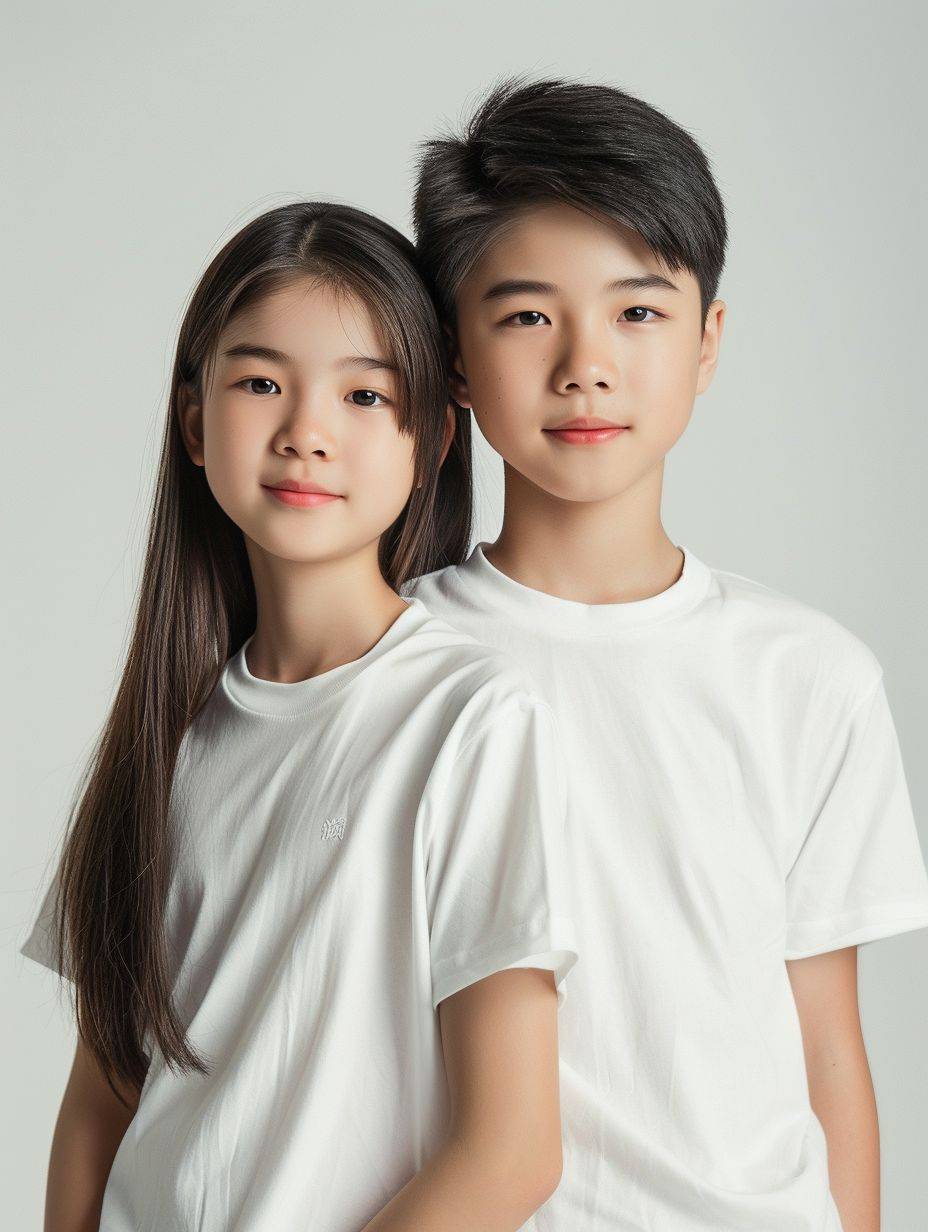 تصوير إعلانات لصبي وفتاة آسيويين جميلين يرتديان قمصان بيضاء، مع التركيز على العناية بالبشرة في خلفية بيضاء ساطعة.