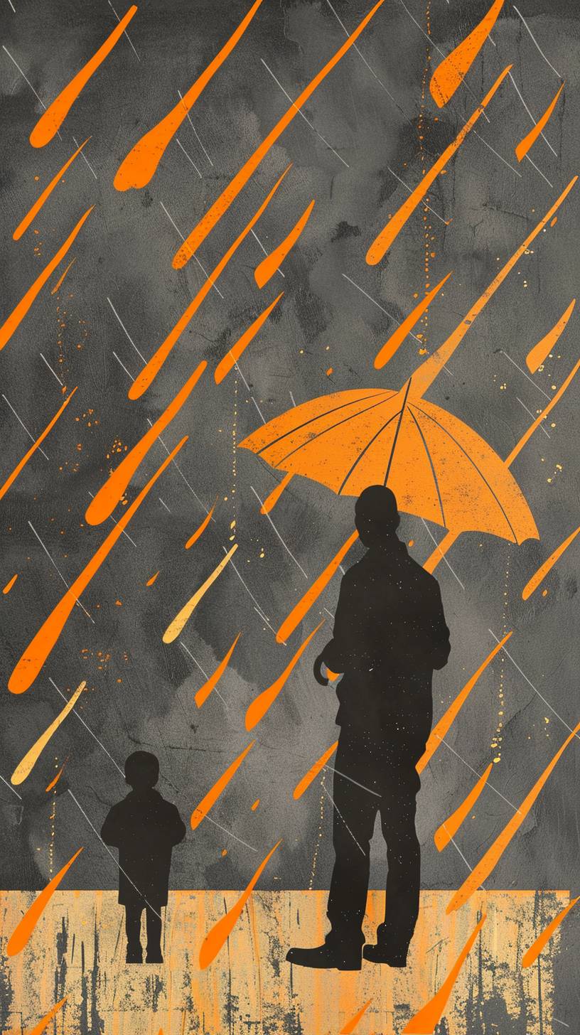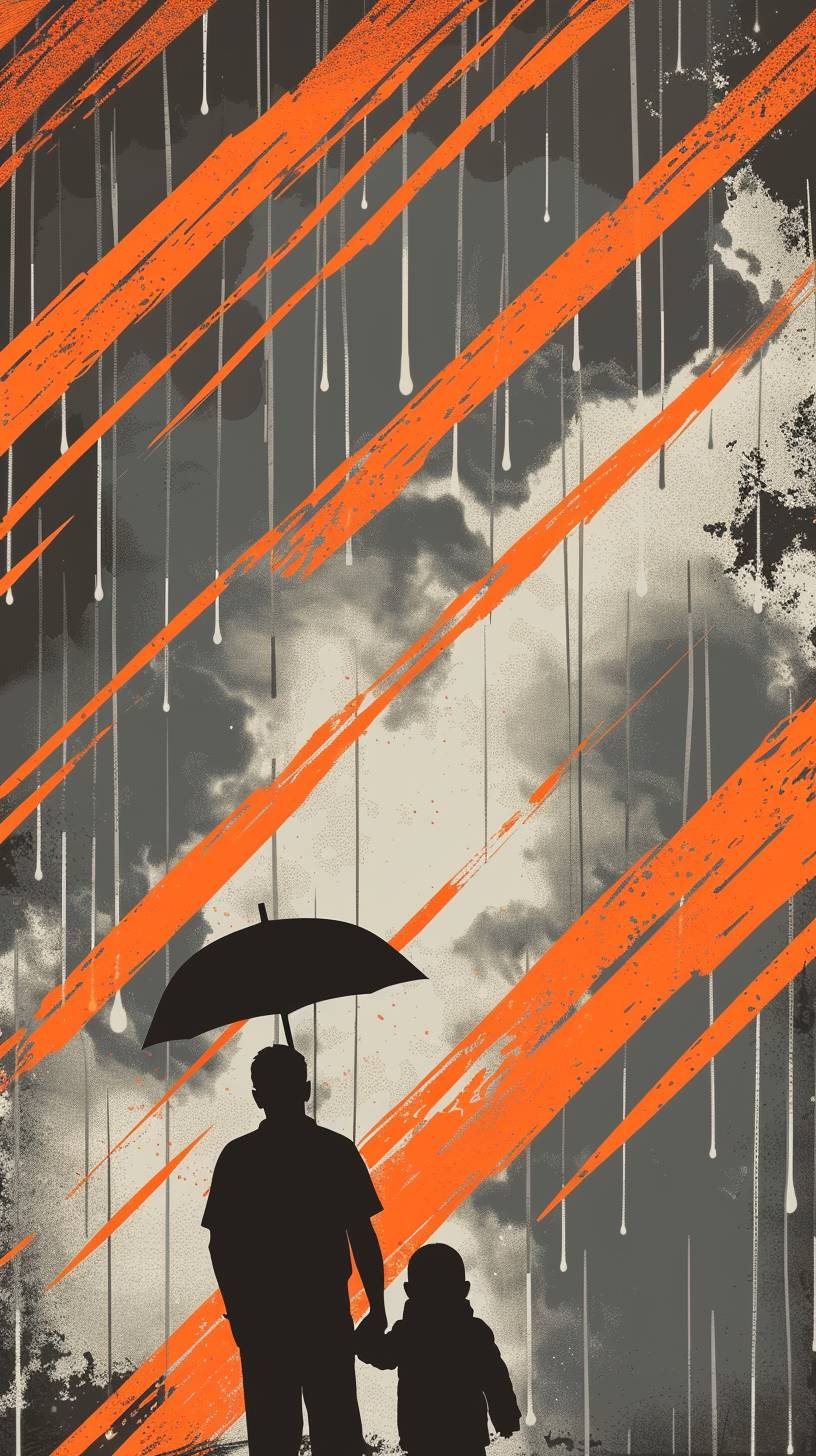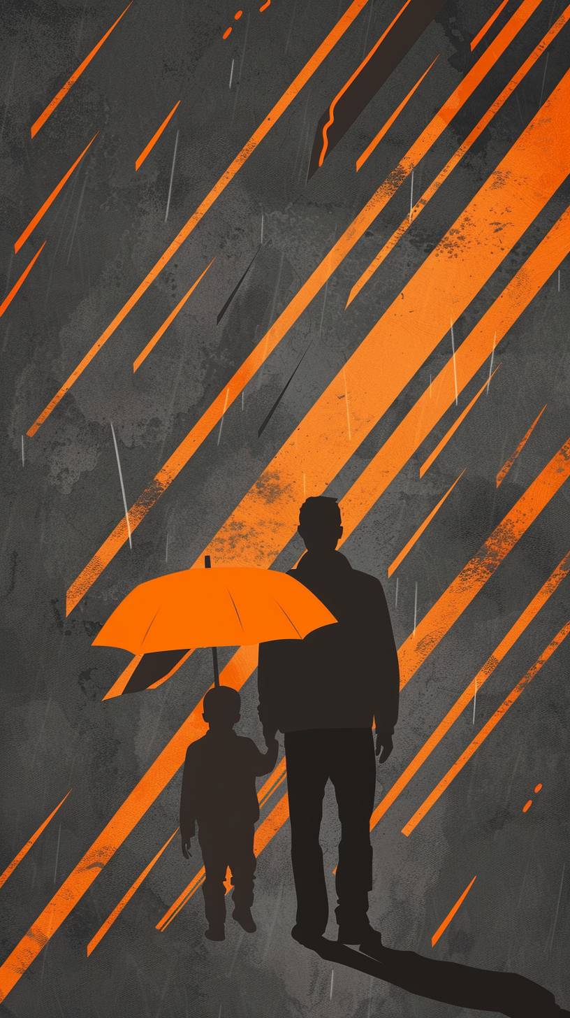 Develop a design that showcases paternal love using a high-contrast color scheme of bright orange against a slate grey background. Position a simplified silhouette of a father and child under an umbrella at the center, with orange rain in a pattern of diagonal lines creating a dynamic sense of movement, interrupted by the umbrella. The grey and orange palette provides a striking backdrop that highlights the father’s protective presence and the warmth of his love. --ar 9:16 --v 6.0