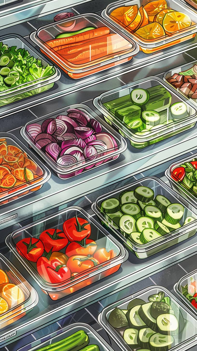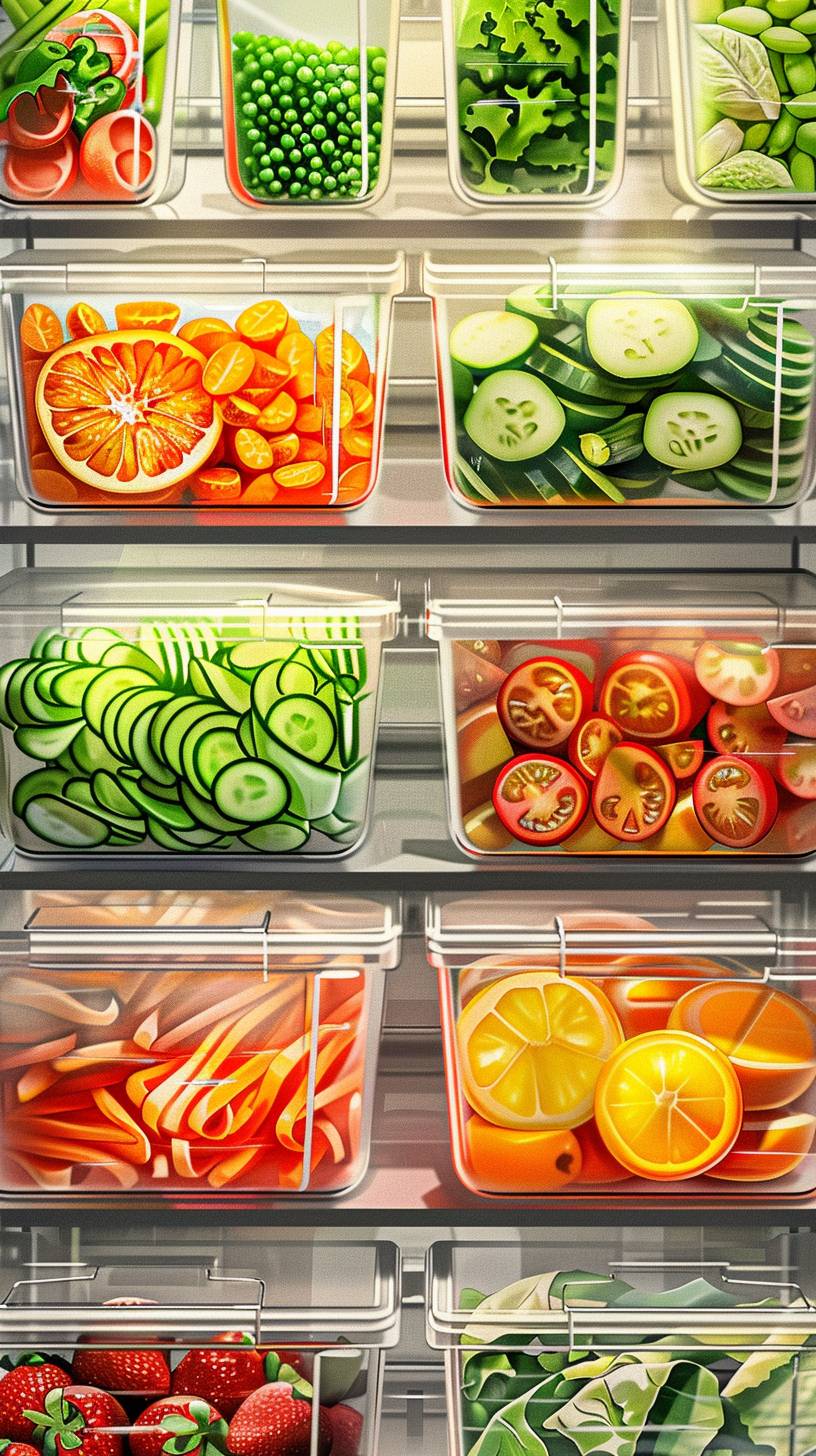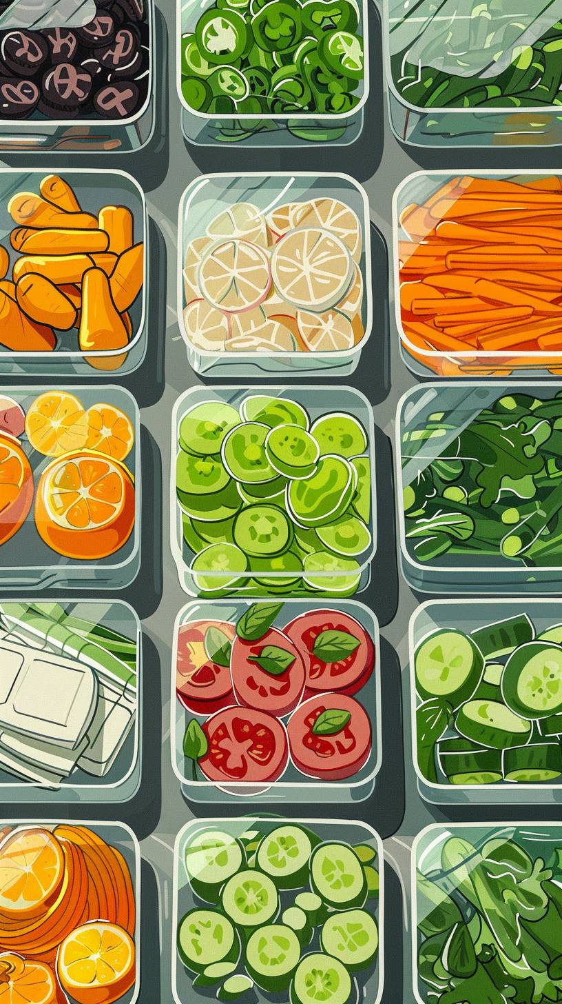 Imagine a highly detailed digital illustration of various prepared foods, neatly chopped and stored in clear glass or plastic containers, showcasing a commitment to healthy eating and meal preparation. The scene includes a variety of colorful vegetables, fruits, and other nutritious foods like diced carrots, sliced cucumbers, segmented oranges, and mixed salad greens, each in its own container. The containers are arranged on a kitchen counter or a refrigerator shelf, emphasizing their organizational appeal and the freshness of the ingredients. Use line art and vector techniques to capture the vibrant colors of the food, the clarity and simplicity of the containers, and the clean, orderly arrangement. The background should be minimalistic, focusing on the textures and details of the prepared food and the transparency of the containers, conveying a sense of healthy lifestyle and efficient meal prep --ar 9:16 --v 6.0
