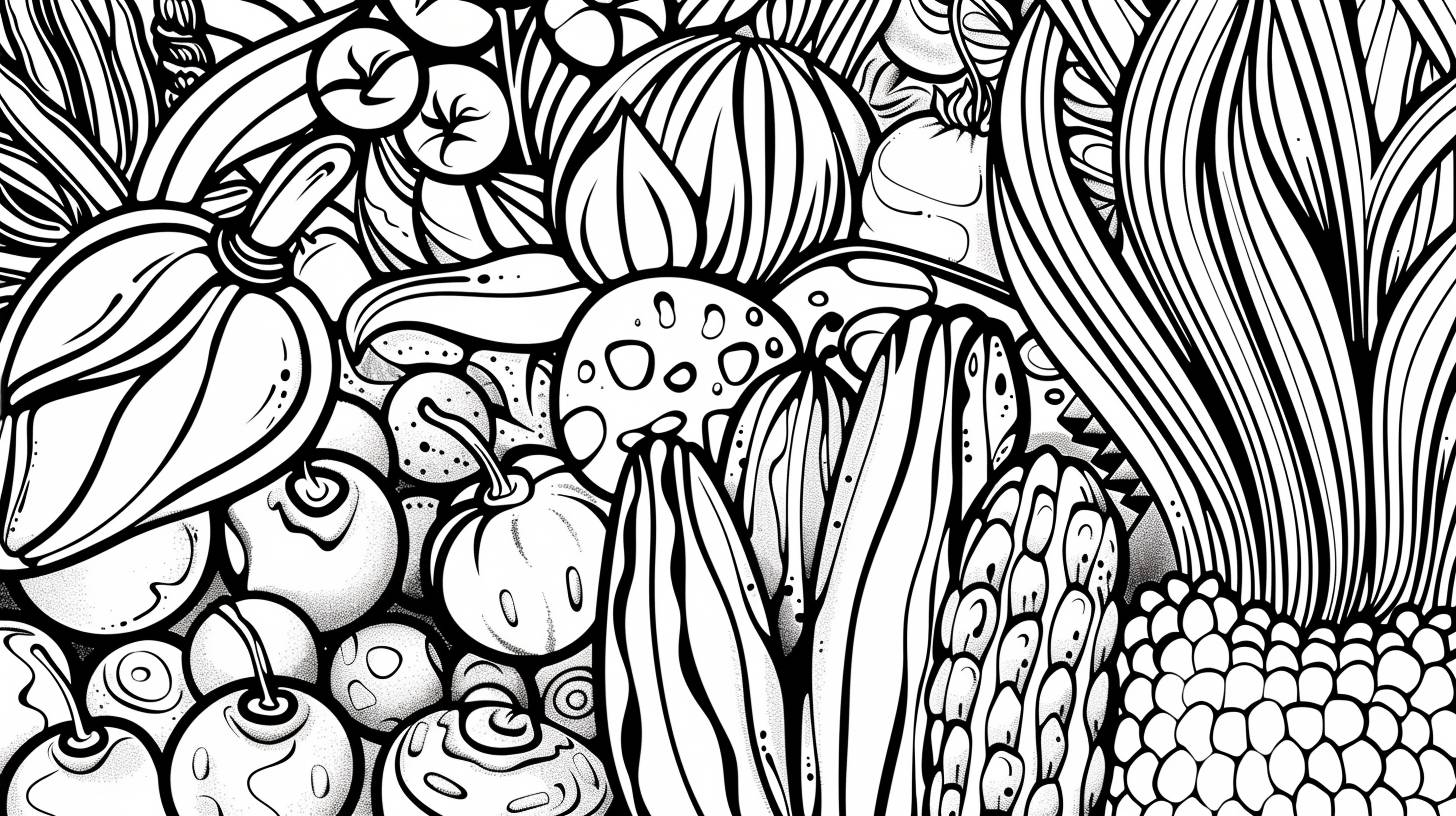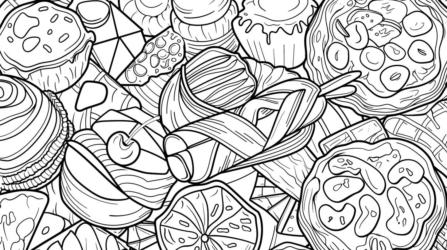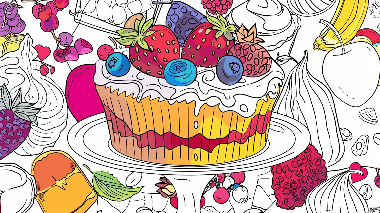 كتاب تلوين للبالغين والأطفال يحتوي على طعام ووجبات خفيفة مع خطوط واضحة وألوان زاهية.
