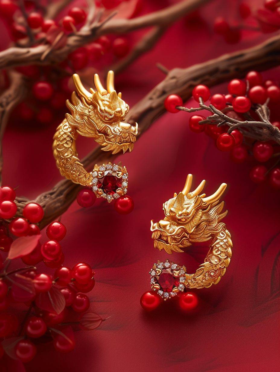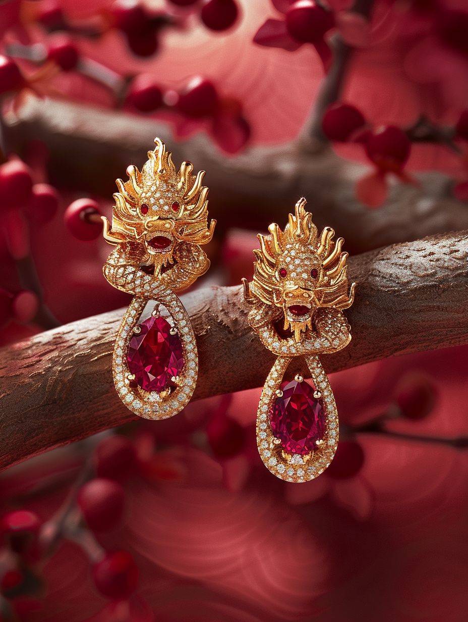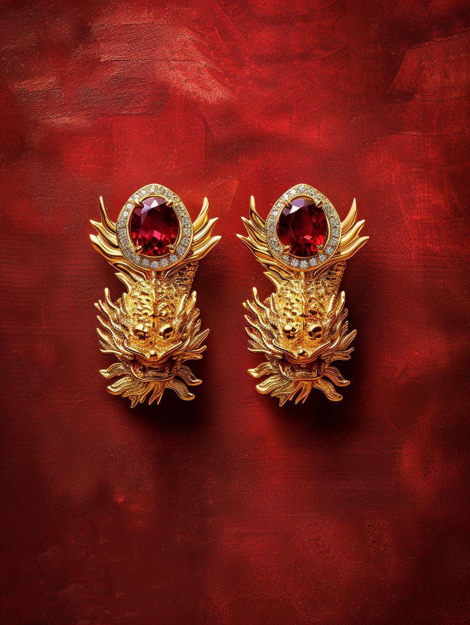 Pair of ruby Chinese dragon head diamond yellow gold earrings, Chinese style, David yurman style, fine rendered texture, yellow gold pattern, delicate, 8K, commercial photography, Chinese New Year red background --ar 3:4 --v 6