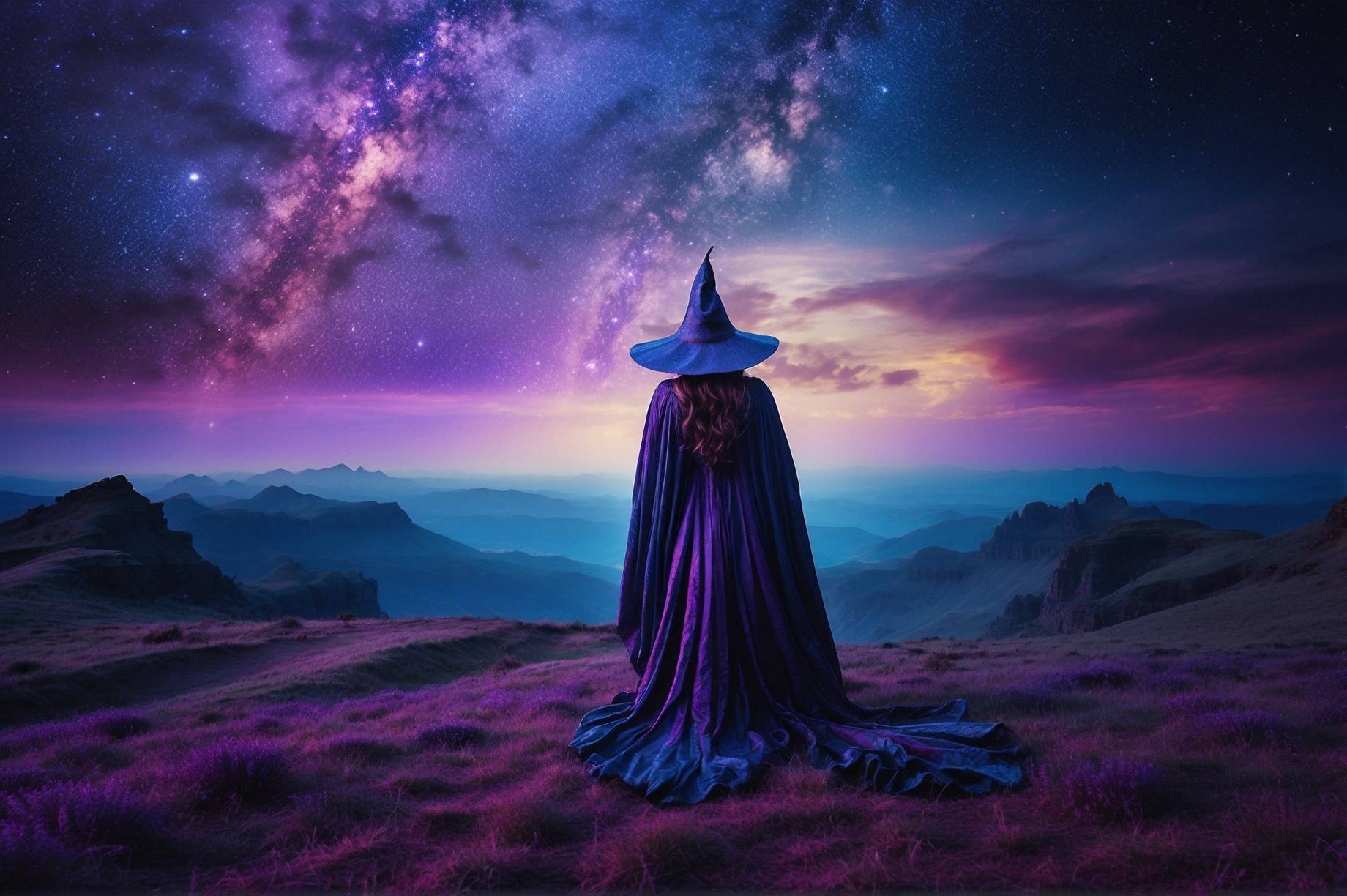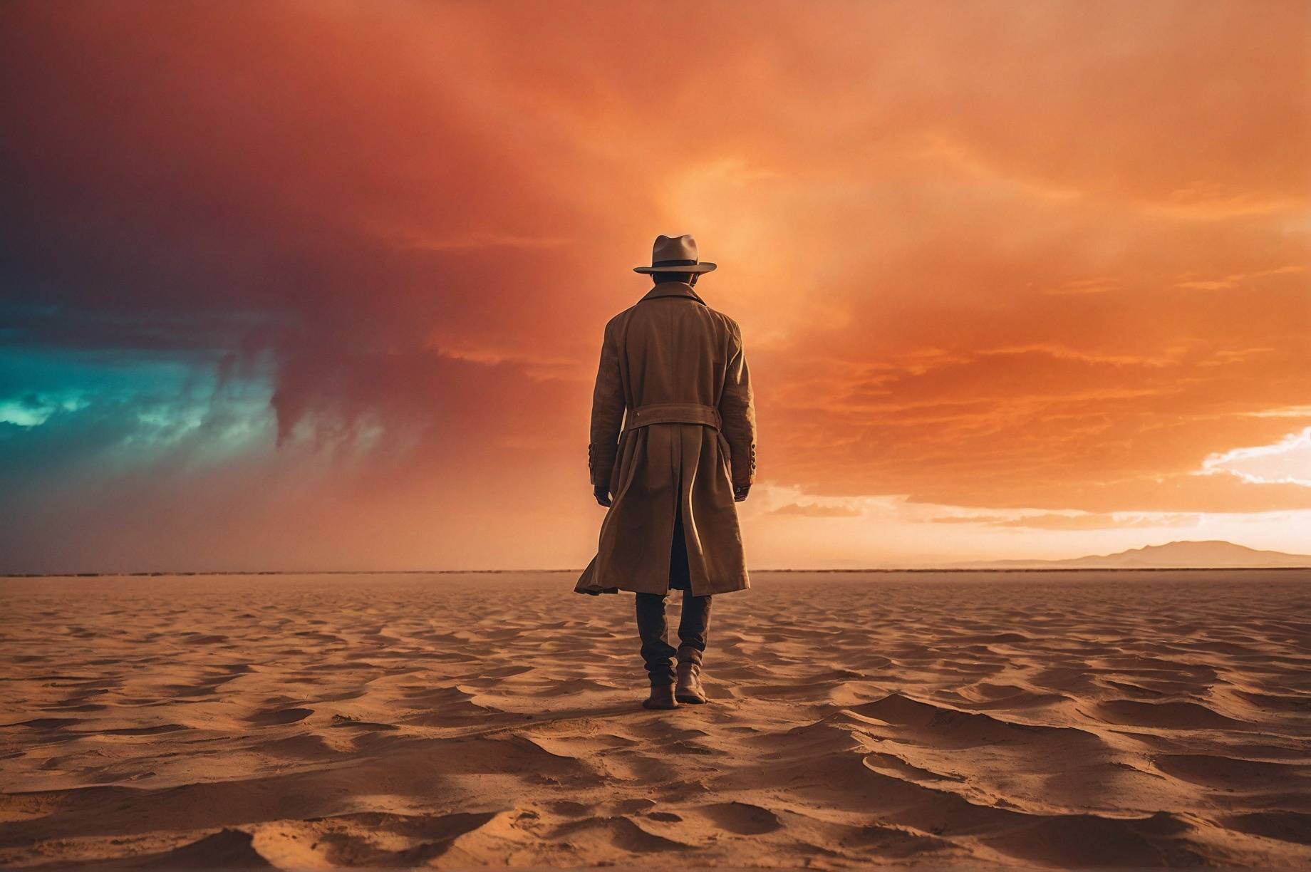 منظر سريالي حيث يمتزج الموضوع بالألوان، مع تأثيرات قزحية وألوان قوس قزح تمزج بين CosmicLumina وSkyDancer، مما يخلق أجواء Etherية.